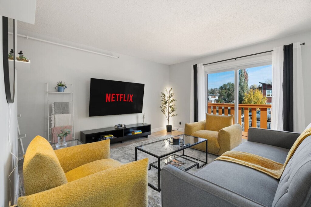 Located in a prime area near the Bow River, this spacious home offers easy access to nature, local shops, and everything you need for a relaxing visit. The large home comfortably sleeps up to 10 people and features two living rooms, three bedrooms, and two full-size bathrooms. Enjoy the convenience of street and rear two-car parking, and feel at home with the fully equipped kitchen, high-speed WiFi, and a 65" smart TV with Netflix. This home is designed with comfort and convenience in mind, featuring two inviting living rooms with comfortable sofas, a futon sofa bed, and access to a patio. The kitchen is fully equipped with a 4-burner stove, oven, microwave, refrigerator, freezer, and dishwasher. Essentials like coffee maker, toaster, blender, and complimentary tea and Brita are provided. The large dining area on the main floor is perfect for gatherings. Enhance your stay with optional upgrades like a National Park Entry, Welcome Basket, Birthday Decor Package, Romantic Wine and Flower Package, Spa at Home Package, Movie Night Upgrade, and more. A Pet Friendly Package is also available. Additional bedding and sleeping arrangements, grocery pre-stocking service, and a diffuser and aroma set can be arranged, subject to availability. Enjoy convenient access to key locations such as Market Mall, Shouldice Park and Aquatic Centre, Bow River Trails, and the University of Calgary, all within a short drive. The home is also near major highways, making trips to Banff, Kananaskis, and Canmore a breeze. Local cafés and dining options are just minutes away, offering a variety of culinary experiences. The property is professionally managed to ensure top-tier service and a smooth stay. Guests can enjoy full self check-in and check-out, with detailed instructions provided. A $250 CAD fine will be charged if smoking is detected, and quiet hours are from 10 pm to 7 am. No parties, excessive drinking, or loud music are allowed. Unauthorized late check-out will result in additional fees. Please remove outdoor shoes while in the home and be mindful of neighbors and bylaws. The home includes an office and den area, providing a comfortable space for remote work. High-speed internet ensures a seamless work-from-home experience, and a work desk is available in the master bedroom.