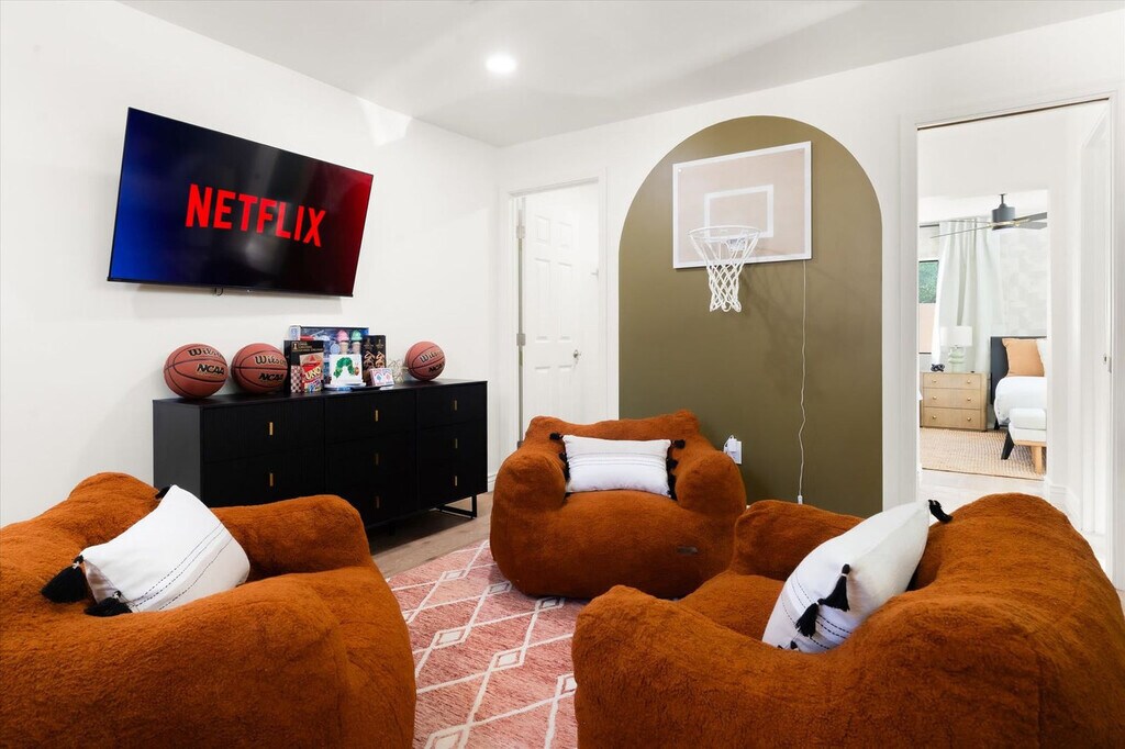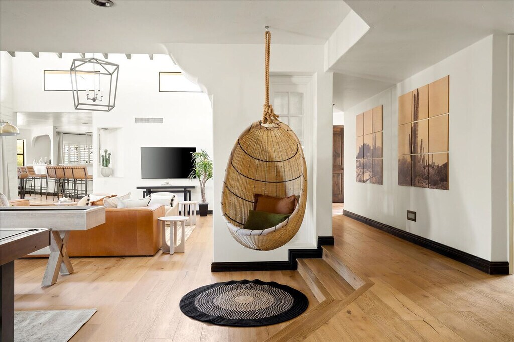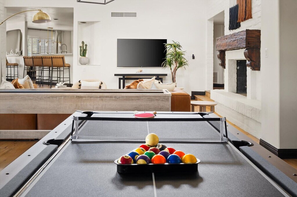 Feel at home in this vibrant 6-bedroom, 5.5-bathroom Arizona oasis in Paradise Valley. This home is perfectly designed for up to 20 guests. This home features a fully stocked chef’s kitchen with high-end stainless appliances, a large refrigerator, ample cabinetry, Keurig and drip coffee makers, a large island with high seating, and modernized lighting. Enjoy the living room with a 65" smart TV, indoor fireplace, leathered sofa, plush seating, modernized lighting, and direct access to outdoor fun. The open floor concept connects to the game room, kitchen, and dining area. The spectacular resort-style backyard and pool area includes a heated private pool, in-ground spa, full pickleball court, basketball court, cold plunge, sauna, outdoor patio/dining area, BBQ grill, fire pit, kid's playground, giant Connect 4, corn hole, horseshoe toss, disc golf, bowling game, ample outdoor space and seating, poolside loungers, and floaties. The game room features a pool table, shuffleboard table, foosball table, and ping pong table. Heated private pool is available for an additional fee of $150 per night. Pets are allowed for an additional fee of $125 per pet. Nearby attractions include unlimited hiking trails including Camelback Mountain, Piestawa Peak, Dreamy Draw, and Phoenix Mountain Preserve. Spring Training Baseball fields are located within a 10 to 15 minute drive. Waste Management Open Golf Tournament is just a 15 to 20 minute drive to TPC Scottsdale. Fashion Square Mall and Old Town Scottsdale are some of the best shopping, bars, and restaurants and are just a 10 minute drive away. Footprint Center (the Phoenix Suns) is about a 20 minute drive. No parties are allowed; violations may result in immediate termination of the stay. Two exterior cameras are installed solely to monitor the cleaning team for quality and security purposes. Parking is available in the driveway for a maximum of 5 cars; street parking is not allowed. Guests must be 25 years or older to book this property. Check-in is at 4pm and check-out is at 10am. Bedroom 1 includes a dedicated workspace. [SI]