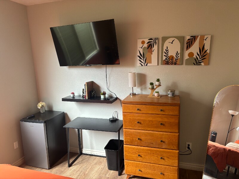 Property Id: 1800651 This is a bedroom (with private bath) in a nice four-bedroom house, with full house access. The furniture and art from this room are being moved to a larger room next door to this room. We do not yet have pictures of that room, but it will still have its own private bath. Perfect for traveling professionals! Everything you need in a cozy space. - High-speed WiFi - Dedicated workspace with ergonomic chair - Free laundry - 24/7 access to fresh linens and towels - Reserved kitchen storage & refrigerator shelf - Ample street parking in quiet culdesac - Full bed with Sealy Posturepedic mattress - Private 4.4 cubic foot mini fridge - Spacious closet and dresser - Personal iron and ironing board - Private bathroom right outside your door - Premium LVT flooring with washable area rug for comfort - Allergy-friendly environment - Living room with 98" TV! - Resort-style backyard with pool fire ring Location & Convenience: - Walking distance to grocery store, Walmart, and multiple restaurants - 15 mins to Oceanside's beaches