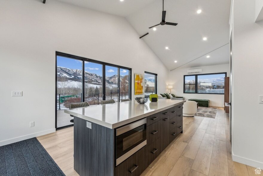 New building located in the heart of Eden's Business District. Zoned CV2. Clad in black corrugated steel, this building is filled with abundant natural light, has stunning mountain views, and was designed in a sophisticated Hygge Style. As you walk across the expansive patio and into this upper level apartment you will be inspired by the bright openness of this space. You will be in awe as you look out towards Nordic Ski Resort, Ben Lemond Mountain, and you'll even be able to see Pineview Reservoir off in the distance. Cosy up in the living room with it's gas fireplace. The modern kitchen will be your perfect spot to make breakfast and your morning coffee. Stacking washer and dryer are an additional convenience with-in the unit. There is even a loft space that could be a fab reading nook, with supplemental storage closets. There are two bedrooms, one with an ensuite bathroom. Large format tiles add to the modern flare of the bathrooms. All rooms have mini-split HVAC systems. Property is leased through the winter and will be available for lease again June.