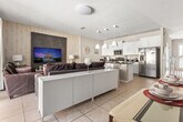 Feel at home in this spacious four-bedroom, three-bathroom apartment that accommodates up to eight guests. With two king-size beds and four twin beds, this home offers ample space for relaxation and comfort. The apartment features a smart TV set-up with a 65-inch TV in the living room, a 50-inch TV in the master bedroom on the second floor, and a 43-inch TV in the twin bedrooms on the second floor. Enjoy high-speed Wi-Fi provided by Spectrum, with speeds up to 100mbps, ensuring seamless connectivity for all your devices. For an additional fee, enjoy the convenience of a private pool and spa with a heater available for $35 per day, with a minimum of three consecutive days. The property is pet-friendly with a fee of $250 for one pet and $150 for each additional pet. Resort amenities are accessible for a fee of $35 for 1-12 guests and $45 for 13 or more guests. Located in Solterra Resort, this home is a short distance from Orlando's world-famous attractions, exceptional shopping centers, and top-notch golf courses. Enjoy easy access to I-4 and proximity to clear lakes, making it an ideal location for both relaxation and adventure. The resort's clubhouse, just an eight-minute walk away, offers a variety of amenities including a fitness center, a large pool with a waterfall and slide, a lazy river, and more. The property is equipped with a pool alarm for safety, but it does not have a safety fence. Smoking is strictly prohibited, and a $250 fee will be charged for any signs of smoking. Grills are not allowed on the property. Check-in is at 4 PM and check-out is at 10 AM. Late check-out must be authorized in advance and is only available until 4 PM. A fee of half the nightly rate applies for unauthorized late check-outs. The property is self-catering, so guests should bring or buy necessary items beyond the basic starter kit provided. Wildlife and pests are common in the area, and while regular pest control is conducted, sightings may occur.