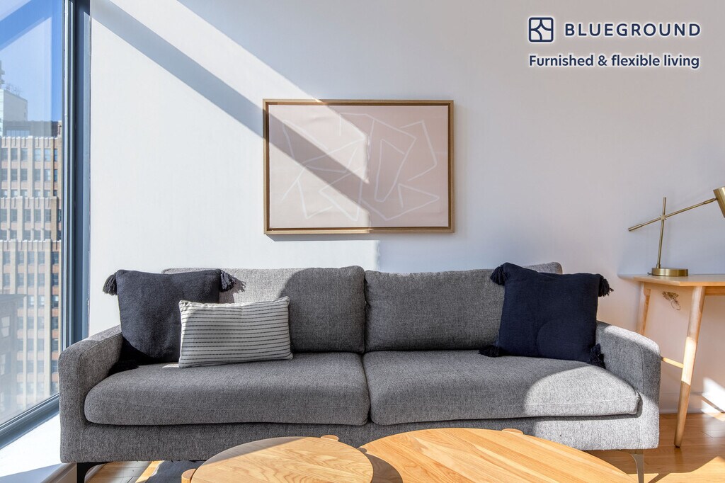 Show up and start living from day one in New York with this sophisticated one bedroom Blueground apartment. You’ll love coming home to this thoughtfully furnished, beautifully designed, and fully equipped Murray Hill home with stunning high floor views over the city. (ID #NYC1304) The advertised rate of $5,920/month is the lowest available price, based on a 11 month(s) and 22 day(s) stay with a move-in date of February 11, 2026. Rates vary depending on the duration of stay, season, and other parameters. For exact pricing and additional pricing components, please visit our website and enter your desired move-in and move-out dates. The rate is applicable when billed upfront; it can be higher if billed in multiple payments. Brokers are welcome to reach out. Were you looking for an unfurnished lease? Try Blueground instead and upgrade from unfurnished to furnished living: - Furnished at rates comparable to unfurnished - No setup or furniture costs - save thousands - Move-in ready - save time, just bring your suitcase Designed with you in mind Thoughtfully designed with bespoke finishes, modern furnishings, and a fully equipped kitchen, you’ll enjoy that “I’m home” feeling with this Blueground apartment. Whether you’re lounging in your sophisticated living room streaming the latest and greatest entertainment on the smart TV or premium wireless speaker, or getting some well-earned rest on the superior quality mattress with luxury linens, you’ll fall in love with everything this Murray Hill apartment has to offer. Sleeping arrangements Queen Bed, 63in/160cm Amenities Building amenities unique to this one bedroom apartment include an on-site: - Doorman - Dryer in building - Elevator - Washing machine in building - Lounge Arrival and ongoing support The entire apartment is yours to enjoy! Throughout your stay, you’ll have access to our Client Experience team through the Blueground App. You can schedule additional cleanings, submit maintenance requests, and view our neighborhood recommendations with just a few taps. We’ll share all details upon confirmation of your stay. Ideally Located This furnished apartment is located in Murray Hill, a lively Midtown neighborhood. The active nightlife scene makes it increasingly ideal for youngsters and recent graduates. Simultaneously, families are relocating here as there are many good schools in close proximity. Murray Hill offers various destinations for culture-lovers. Namely, the New York Public Library and Bryant Park draw residents in from the rest of the city. Grand Central Station is only 5 minutes from Murray Hill by subway. Other things to note Building amenities may have an extra cost. This Blueground apartment has flexible lease options, allowing you to book it for one month, a year, or more. Brokes CYOF. We take great pride in ensuring every photo displayed is shot in our own units with our actual furnishings. That said, we regularly refresh our decor and furniture arrangement, which may differ from what’s pictured. [SI]