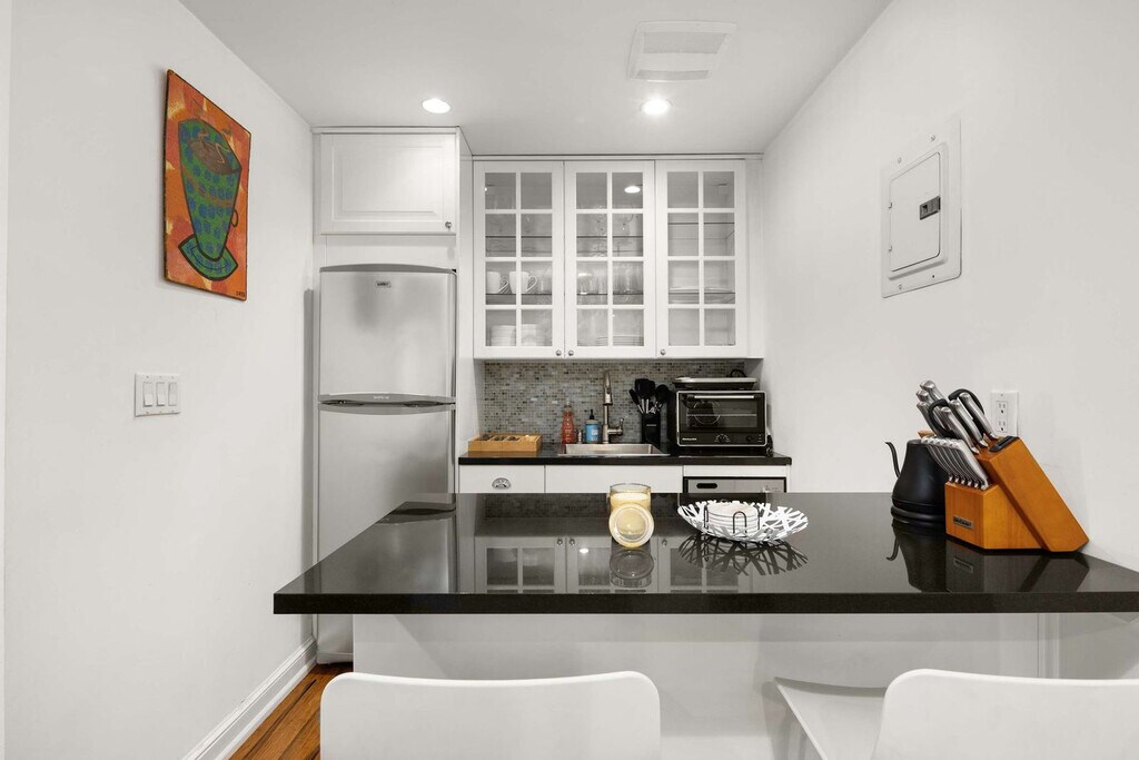 Situated in the heart of Flatiron, on a quiet street between 5th and 6th Avenues, this bright, gut-renovated 1-bedroom apartment offers a quiet oasis in the heart of NYC. Featuring designer furniture, a renovated kitchen and bathroom, blazing-fast Wi-Fi, hardwood floors, and high-quality finishes, this home offers a sophisticated living experience to guests. Welcome to Madison Gardens. This street-level apartment features south-facing windows, bringing an abundance of light into the space. Adorned with furniture from CB2, West Elm, and similar brands, this space effortlessly blends comfort and style. The open and recently renovated kitchen is outfitted with granite countertops, bar seating, and stainless steel appliances, including a dishwasher. The bedroom area offers a cozy retreat, outfitted with ultra-luxe linens and a closet, providing a private and restful space for a couple or solo traveler. The marble-tiled bathroom features a rainfall showerhead and elegant, modern finishes, creating a spa-like feel in the heart of the city. The apartment includes blazing-fast Wi-Fi and a fully furnished interior designed for comfort and ease. Haus' concierge service can coordinate cleanings, private events, and more for guests. We're able to schedule private chefs, excursions, and more, just ask us when you book and we'll be happy to accommodate your preferences. Utilities for this unit are included in the listed price (Wi-Fi, electric, heat, etc). Excessive use of A/C (exceeding $250/mo) will be billed back to guests after move-out. Located just steps from Whole Foods, Trader Joe’s, and multiple subway lines (A, C, E, F, M, 1, 2, 3, L, and PATH), the home offers style, practicality, and connectivity in one of Manhattan’s most dynamic neighborhoods. Smoking is not allowed on the property.