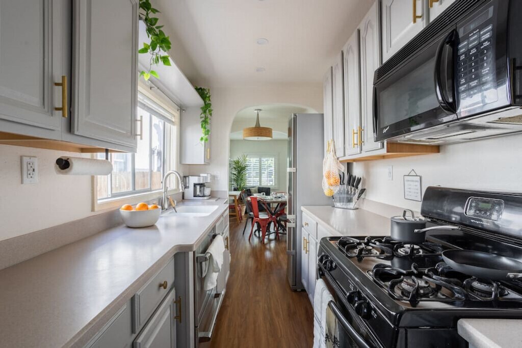 Step into this light and airy beach bungalow and feel right at home. This tranquil oasis provides the perfect setting to relax with family or friends, offering all the amenities to make your stay comfortable and stress-free. Enjoy easy access to the best of Ocean Beach, including Dog Beach, Sunset Cliffs, Robb Field Park, and local dining and nightlife. The main house includes one king-size bed, one queen-size bed, one sofa bed, and two bathrooms, while the detached cozy studio suite in the back boasts high ceilings, a kitchenette, a Murphy queen bed, and a bathroom. There are A/C mini-splits and a portable A/C unit in each bedroom, ensuring a cool environment inside. The fully stocked kitchen is equipped with everything you need, from cookware to coffee makers and BBQ utensils. The back studio kitchenette includes essentials for your convenience. Enjoy the cozy front yard for outdoor sitting and dining, and a sizable backyard with a full dining area, a fire pit, BBQ, and a sitting corner. Ask about add-ons such as early check-in, late check-out, Pack 'n Play Crib, beach wagon, surf and boogie boards, and car rentals to save the hassle of the rental agency. Pets are welcome with a $100 fee per pet per stay. Please keep pets off the beds, comforters, and sofas to avoid extra cleaning or replacement fees. Undeclared pets, including ESAs, will incur a $200 fee per pet. For monthly guests, there is a utility cap of $350, and guests will be responsible for any overages. The historic neighborhood of Ocean Beach is famous for its laid-back atmosphere and strong sense of community. With walkability to everything "OB" has to offer, you can surf in the morning, shop midday, enjoy beautiful sunsets, and end the day with a fancy dinner, all within a short walk back home. Public transportation options like buses, Ubers, and Lyfts are readily available nearby. This property is equipped with a device that monitors the environment inside, including noise levels, temperature, and motion, to ensure a pleasant stay and avoid disturbing neighbors. Quiet hours are from 10 p.m. to 9 a.m. No parties are allowed, and undeclared guests will be charged $65 per person. Smoking indoors will incur a $200 charge. Do not unplug or tamper with any Wi-Fi, outdoor security cameras, or locks, as fees will apply. Shoes should be removed upon entry, and coasters and trivet mats should be used to prevent damage to surfaces. Garbage disposal guidelines must be followed to prevent malfunctions. This apartment is remote work-friendly with fast Wi-Fi, blackout curtains, and desks available for your convenience.