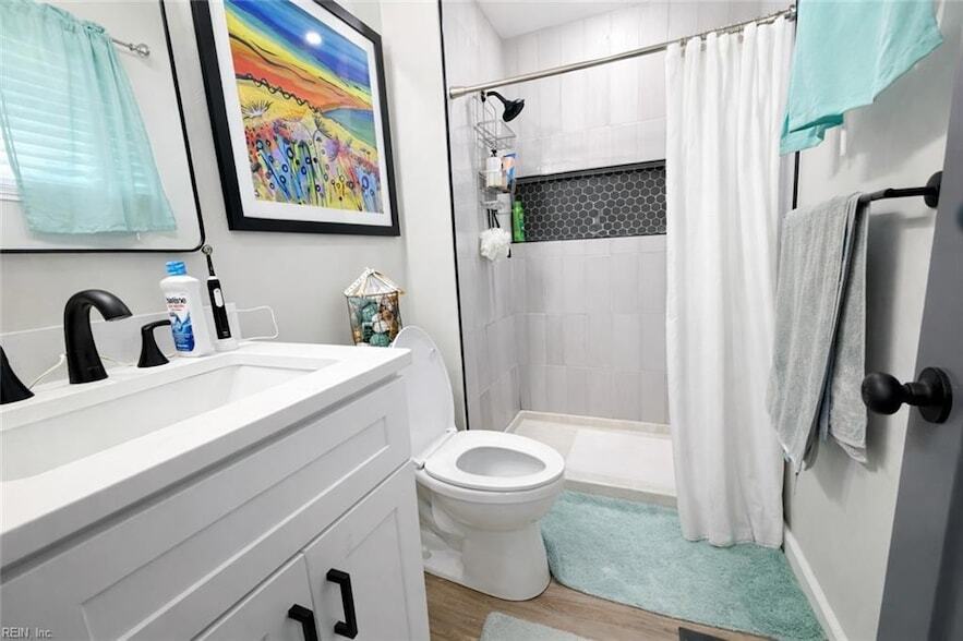 Beautifully updated brick ranch offering modern style, functional space, and exceptional indoor-outdoor living. The bright open-concept layout features luxury plank flooring, recessed lighting, and a spacious living area that flows seamlessly into a renovated kitchen with white shaker cabinetry, stainless steel appliances, and a large quartz island for entertaining. The adjoining dining and living areas overlook the backyard through expansive sliding glass doors, filling the home with natural light. The primary living spaces provide a comfortable, airy feel for everyday living and gatherings. The updated bathroom features a modern vanity, stylish tile shower, and contemporary fixtures. Outside, enjoy a large private backyard and patio for relaxing, grilling, or hosting guests. The freshly landscaped front yard enhances curb appeal while the attached garage offers excellent storage and workspace.