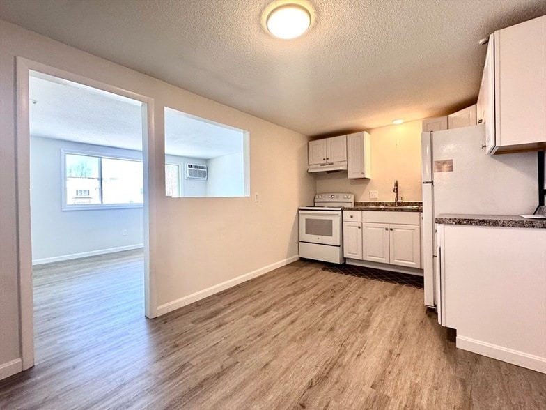 Welcome to your sunny, top floor 1-bedroom apartment nestled in Waltham just steps from Moody Street! As you enter the unit, you are met with an updated kitchen that features all white appliances, updated countertops and updated flooring throughout. The living room features a cut out looking into the kitchen, updated flooring and an AC unit. Plenty of room for your furniture which allows you to personalize the space to suit your lifestyle. Great sized bedroom with more updated flooring, a good sized closet and overhead lighting. Tiled bathroom with shower and ample closets for all your storage needs. At this location, you'll enjoy easy access to an array of local amenities, including shops, restaurants, and more! With nearby public transportation options and major highways just minutes away, commuting to Boston or exploring the surrounding area is a breeze. Additional features include common card/mobile-pay laundry, one assigned parking spot, and pets allowed for an additional fee.