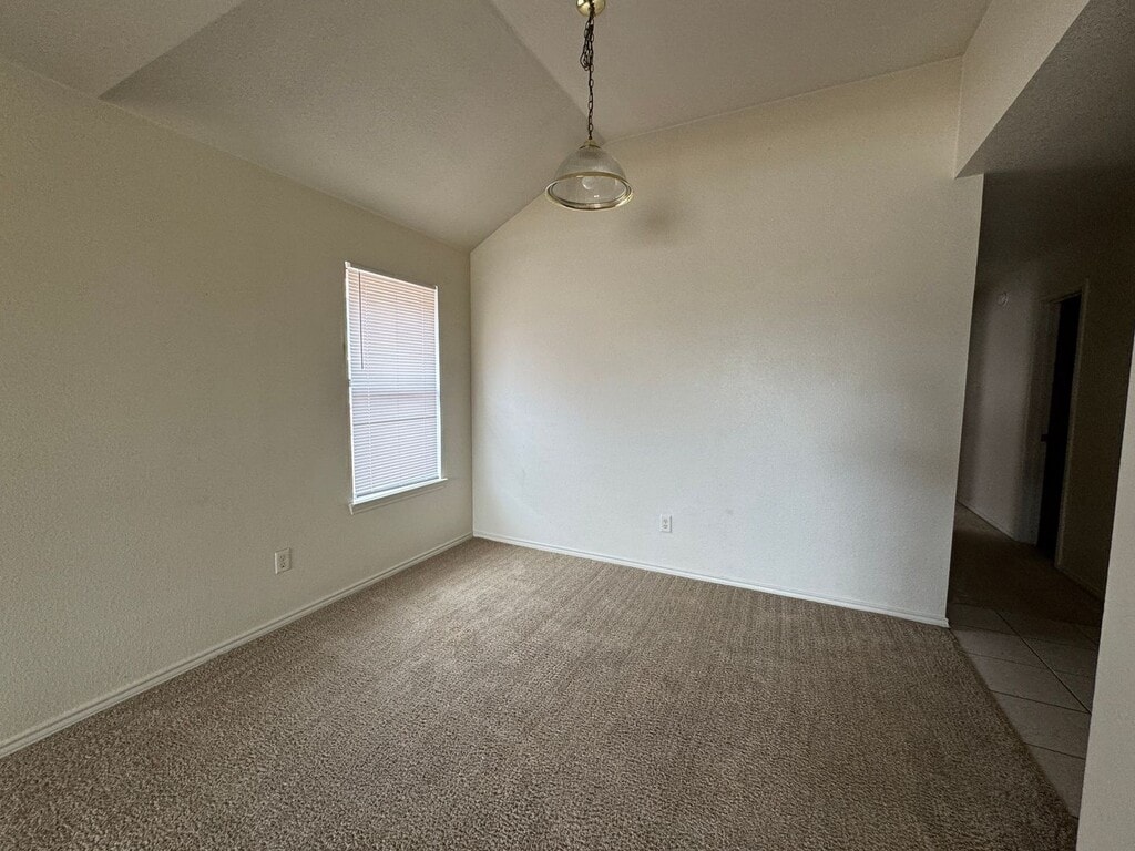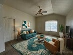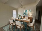 View virtual 360 tour: 3 bed 2 bath duplex offering 1,178 sq. ft. of living space with an attached 1-car garage. The kitchen features a pantry, ample countertop and cabinet space, a refrigerator, dishwasher, stove, a dedicated dining area, and an adjoining laundry room. Flooring includes carpet in the living/dining areas and bedrooms, with ceramic tile in the kitchen and bathrooms. The primary bathroom includes a single vanity and a garden tub/shower combo. Additional features include ceiling fans throughout, roomy bedroom closets, a fenced backyard, and a spacious covered porch for outdoor enjoyment. Disclaimer: The furnishings or enhancements shown are AI-generated and intended for inspiration only. They may not reflect the actual scale, condition, or current features of the property.