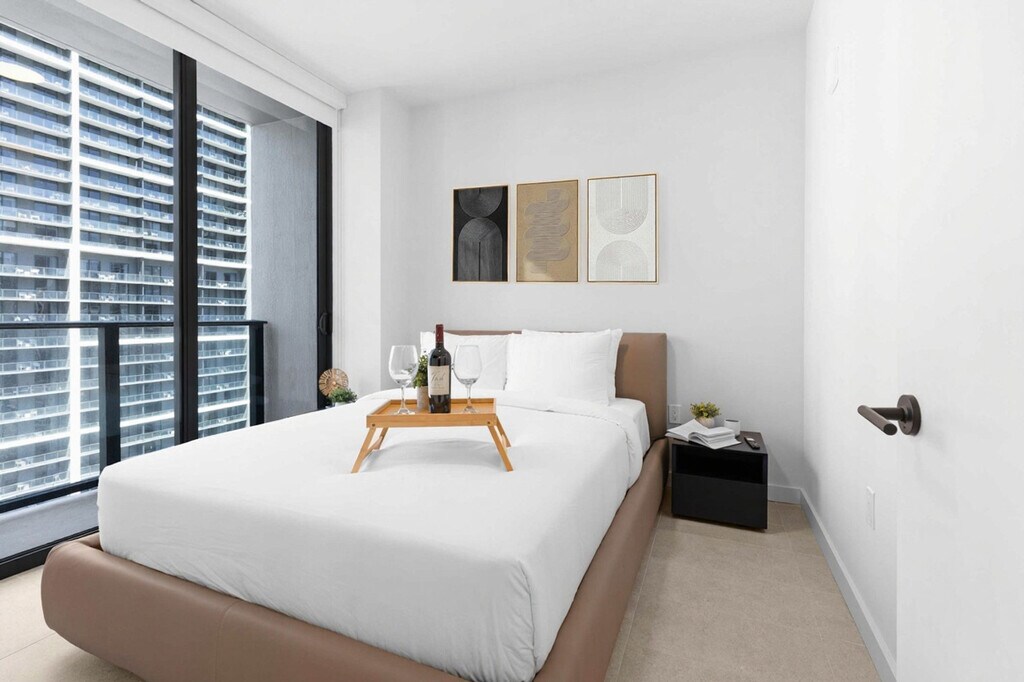 The advertised rate of $5,323/month is the lowest available price, based on a 1 month(s) stay with a move-in date of September 8, 2026. Rates vary depending on the duration of stay, season, and other parameters. For exact pricing and additional pricing components, please visit our website and enter your desired move-in and move-out dates. The rate is applicable when billed upfront; it can be higher if billed in multiple payments. Experience elevated Miami living and feel at home in this bright 1-bedroom plus den residence with two full bathrooms and a private balcony. Floor-to-ceiling windows fill the open living area with natural light. This fully furnished residence features clean European lines, floor-to-ceiling glass, and refined finishes. The sleek European-style kitchen is fully equipped with custom Italian cabinetry and counters, an integrated paneled refrigerator/freezer, a speed oven, a dishwasher, a coffee maker and kettle, cookware and kitchen essentials, silverware, dishes and wine glasses, matte black Kohler fixtures, and an in-unit washer and dryer. The bathrooms feature custom Italian vanities, matte black Kohler plumbing fixtures, contemporary counters and cabinetry, and finished flooring. Valet service is conveniently provided. Self-parking is managed by a third-party company, Metropolis, and requires a separate payment directly with them. Parking rates are $15 for 1 hour, $20 for 2 hours, $30 for 3 hours, $40 for 10 hours, and $50 for 24 hours, and all rates are subject to taxes and additional fees. Located in the heart of Downtown Miami at 501 NE 1st Ave, you’re minutes away from culture, nightlife, dining, and waterfront views. Bayside Marketplace, Kaseya Center, and Bayfront Park are all within a short distance. This central location makes it easy to explore the city. Public transportation is readily accessible, with the College/Bayside Metromover Station, Government Center Metrorail Station, and Brightline Miami Station all nearby. Parking enforcement is active 24/7. Please do not place cardboard in the trash chute. Flatten boxes and take them to the loading dock. To prepare for check-in, please provide your full legal name, phone number, email address, and confirmed check-in and check-out dates and times prior to your arrival. [SI]