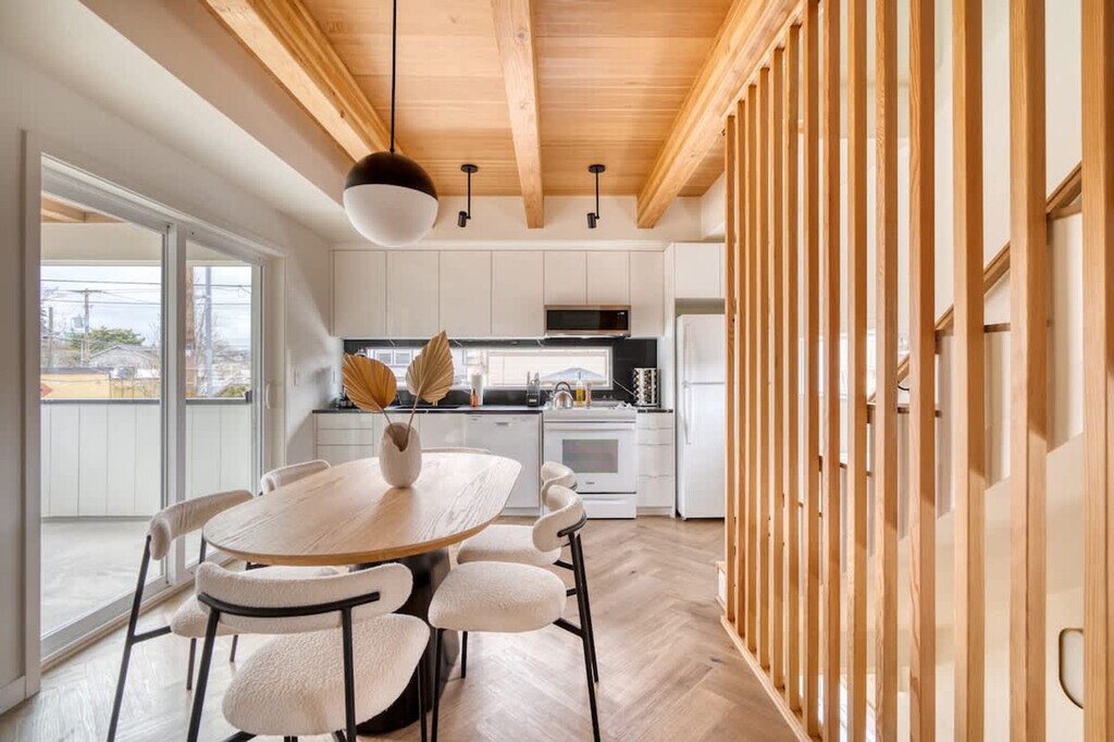 Stay in Portland’s Alberta Arts District in this 3-bedroom townhome featuring soaring ceilings, designer finishes, and two Juliet balconies. Walk to cafés, parks, and boutiques. The apartment includes a chef’s kitchen, patio, Smart TV, and in-unit laundry. For larger groups, the separate downstairs mother-in-law suite can be booked to create a 4-bedroom, 2-bathroom full-home rental with two private entrances. The ground floor offers a private queen bedroom, perfect for light sleepers or early risers, providing a quiet and well-appointed space ideal for relaxing or working remotely. The main floor is defined by soaring wood-beam ceilings and herringbone floors, with a fully stocked kitchen featuring modern appliances. The living area includes a comfy sectional, Smart TV, and access to a small outdoor patio, perfect for morning coffee or evening wine. The third floor houses two sunlit bedrooms with oversized sliding doors opening to Juliet balconies, sharing a modern full bathroom with dual sinks and a tub/shower combo. The in-unit washer and dryer are conveniently located on this floor. The downstairs mother-in-law suite can be rented separately or together with the main unit. It includes a fourth bedroom, en-suite bathroom, kitchenette, and private entrance, perfect for guests needing extra privacy or a second full bathroom. Alberta Arts is one of Portland’s most vibrant and walkable neighborhoods, bursting with color, culture, and creativity. Murals line the streets, and nearly every block hosts an art gallery, boutique, coffee shop, or food destination. Enjoy inventive ice cream flavors at Salt & Straw, brunch at Tin Shed Garden Cafe, or local beers at Great Notion. On the last Thursdays of the month, the neighborhood transforms into a lively open-air art walk with music, food, and local vendors. Alberta Park is just a few blocks away for green space and a relaxing stroll. The location is just 15 minutes from downtown and 20 minutes from the airport, offering proximity to everything while being tucked into one of Portland's most beloved residential pockets. This listing is for the 3-bedroom, 1-bathroom main unit only. The home also includes a separate, fully private mother-in-law suite on the ground floor with its own entrance, en-suite bathroom, and kitchenette. That space may be occupied by another guest during your stay unless you choose to book the entire property. If you’d like full access to all 4 bedrooms, 2 bathrooms, and both entrances, please inquire about booking the full home. The hallway shown in some listing photos connects the main house to the in-law suite but remains locked and secured. To ensure your privacy and peace, this interior door is covered with a sound-dampening curtain. This is a multi-level home with stairs between each floor and may not be suitable for guests with mobility challenges. Quiet hours are between 22:00 and 8:00. Cats are not allowed. The apartment is remote work-friendly with fast Wi-Fi throughout, providing a quiet and well-appointed space ideal for working remotely.