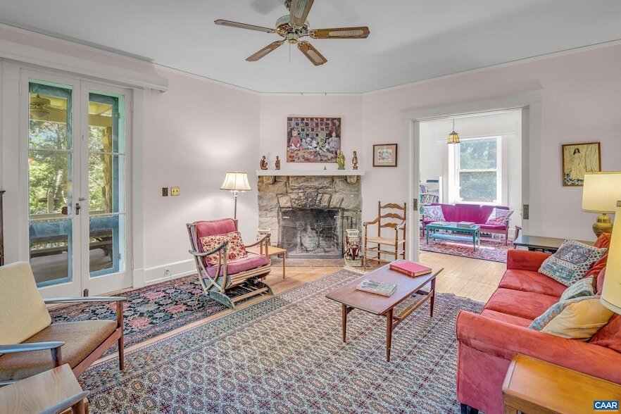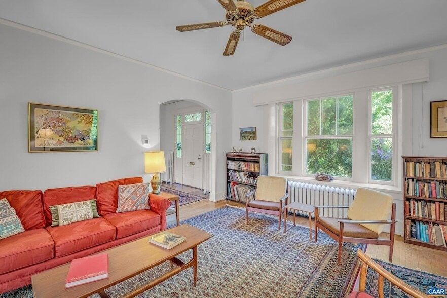 North Downtown: 1903 Arts & Crafts style home furnished w/curated mix of mid-century modern furniture, vintage Youngstown Steel kitchen cabinets & bespoke treasures from travels around the world. Designed by renowned architect Eugene Bradbury, featuring stone & stucco construction w/stained glass, pocket doors, fireplaces & private porches. Step into the gracious foyer and there is a living room w/fieldstone fireplace opening to a large, covered veranda. Beyond the orig. pocket doors is a cozy den/home office. To the right of the foyer is the classic dining room w/deep-set fireplace, stained-glass windows, Charles Steiff piano. Fully equipped kitchen inc. gas stove & breakfast room w/floor-to-ceiling bookshelves; butlers pantry now holds the washer/dryer. Full bath on the 1st floor. Up the gorgeous staircase are 4 BR & 2 additional baths. 2 BRs have private balconies, all have decorative fireplaces. 3rd Floor can function as storage. Hot water radiator heat, Windmill whisper-quiet A/C units. In addition to the front porch, side porch, and upstairs balconies, the home has a lovely large yard w/mature trees & plenty of parking. Inc. are landscaping/yard maintenance. Pets are on case-by-case basis. Ten minute walk to Downtown Mall.