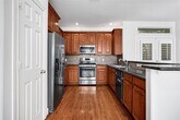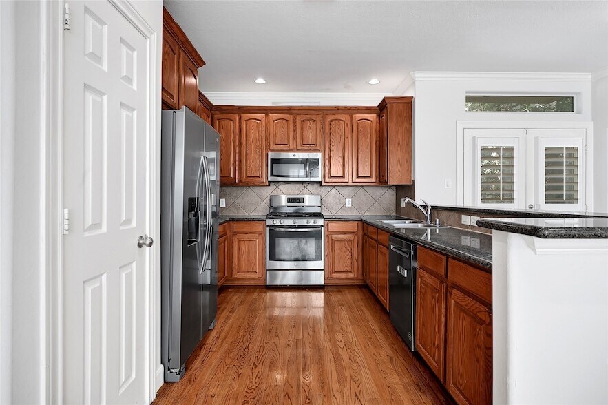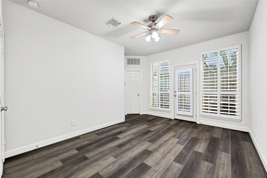 Coveted Rice Military freestanding townhouse. This home has 3 bedrooms, 3 1/2 baths, with an open floor plan and good size backyard. No carpet throughout. 1st floor with new vinyl floors, en suite bath, and access to paver backyard. Open concept 2nd floor. Kitchen w/ granite countertops and stainless steel appliances. Off the kitchen is a balcony. Living room w/ gas fireplace. Large master bedroom w/ 2 walk in closets. Master bath w/ dual vanity, whirlpool tub, separate shower, and water closet. Secondary bedroom with tray ceiling and ensuite bath. Plantation shutters throughout. All bathrooms have been updated with quartz counter tops and new cabinetry. Smart technology included such as ring door bell and nest thermostats. Washer and dryer stay. Easy access to Memorial and Buffalo Bayou Park. Nearby grocery stores, restaurants, and shopping.