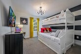 Welcome to this stylish home located in Kissimmee, just 10 minutes from Disney parks at the luxurious Storey Lake resort. Perfect for your family's vacation, this home offers a private pool and spacious accommodations for up to 11 guests. It features two king-size beds, two twin beds, and a bunk bed with full and twin beds. A fully equipped kitchen completes this ideal family vacation rental. This spacious and stylish home provides the perfect setting for a family vacation. The main living area is a large open concept with plenty of seating for everyone. The fully equipped kitchen contains all the necessary appliances, cookware, and dinnerware for a comfortable stay. The two king bedrooms offer a sense of luxury and comfort, one located on the first floor and the other as the master suite on the second floor. Also on the second floor, you will find one bedroom with one full and one twin bed, while the Mickey-themed bedroom, with a bunk bed featuring a full and two twin beds, offers a fun and exciting experience for the kids. These two bedrooms share a bathroom. After a long day at the parks, relax in the comfort of your own private pool. For your convenience, the home includes a laundry room with washer and dryer, free Wi-Fi, free parking, and a welcome package with basics for the bathroom and kitchen. Replenishment of these items is the guest's responsibility. Storey Lake Resort boasts a perfect location just 10 minutes from all major attractions and theme parks in Orlando, including Walt Disney World, Universal Resort, and Sea World. The resort offers fantastic amenities for the whole family, such as a tiki bar, a resort-style pool with slides and a lazy river, sports court, mini-golf, kayak, and fitness center. There are two clubs within the property, one featuring a themed pirate pool that kids will love, just walking distance from the house. Located just off Osceola Parkway, the resort provides easy access to restaurants, shopping, and supermarkets, all within a 5-minute drive. Quiet hours are between 22:00 and 8:00. [SI]