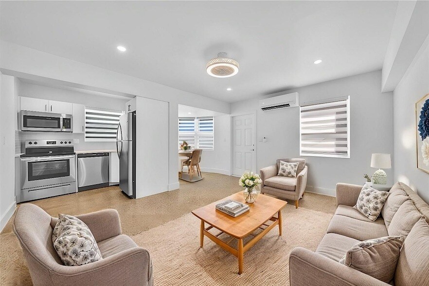 Amazing One bedroom unit with Fantastic Location! 1.5 Miles to the Beach, Restaurants, Hospitals and much more! Fabulous four-plex apartment with assigned parking, laundry facilities and a shared pool. Totally Renovated with impact windows, new roof, beautiful white kitchen, stainless steel appliances, quartz counter tops, new baths, freshly painted, new AC split system, new doors, and restored mid century terrazzo flooring. *water and trash included*