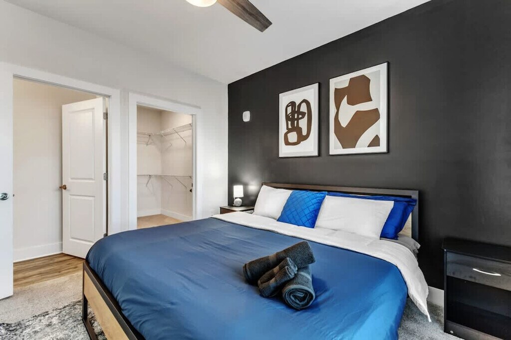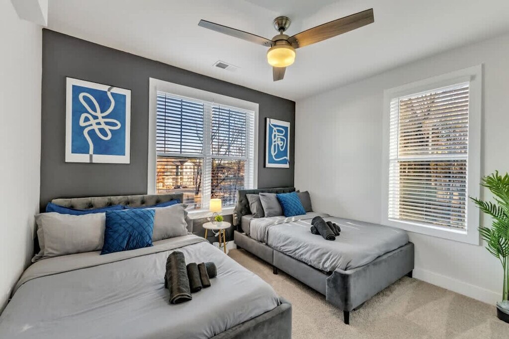 Stay in style in the vibrant city of Durham, famously known as the "Startup Capital of the South." This elegant 1,332-square-foot apartment features three bedrooms and two bathrooms, complete with two king-size beds and two plush full beds for your comfort. Enjoy lightning-fast Wi-Fi, a separate workstation, and a fully equipped kitchen, all designed for your long-term stays. Located in the heart of Durham Central Park, you're just steps away from restaurants, cafés, bars, and shops. Begin your day with a perfectly brewed cup of tea or coffee from the convenient coffee station in your upscale kitchen. Whether you're here for business or leisure, this space offers the perfect balance of comfort and convenience. With vibrant restaurants just minutes away, explore Durham's culinary scene each night. After a long day, your well-equipped kitchen and elegant dining table are ready to provide a 5-star dining experience at home. This inviting open-concept living area is elegantly furnished, featuring plush seating, a 55” Smart 4K TV, and large windows that flood the space with natural light. Free on-site parking is available on a first-come, first-served basis. We welcome up to two pets per reservation, each weighing under 35 lbs, with a fee of $49 per pet for stays of 1–6 nights. Additional charges apply for longer stays. A one-time $49 large pet fee applies for pets over 35 lbs. Early check-in and late checkout are available based on availability, with fees of $35 for 1 hour and $49 for 2 hours. Optional mid-stay cleaning is available for $175, including new linens, surface cleaning, and trash removal. Situated in a vibrant neighborhood, this property places you within minutes of top attractions, dining, and nightlife. Enjoy easy access to Durham Bulls Athletic Park, Museum of Life and Science, Durham Central Park, The Carolina Theatre, Southpoint Mall, Lake Pine, Hillsborough Road Park, and the Museum of Durham History, all within a short drive. Quiet hours are enforced from 8:00 PM to 8:00 AM. Noise levels exceeding 80 decibels for more than 10 consecutive minutes will result in a $2,500 fine and immediate removal from the property. Smoking is strictly prohibited, and tampering with smoke detectors will incur a $2,500 fine and removal from the property. Unauthorized guests will result in a $500 fine per person and cancellation of the reservation without refund. All guests must complete identity verification prior to check-in. Access details will be shared 24 hours prior to check-in after verification is completed. Guests are responsible for disposing of all trash and recycling in designated dumpsters. Unauthorized late checkouts are considered trespassing and may result in additional charges. The apartment is perfect for business travelers, featuring a dedicated workstation with a standing desk and high-speed Wi-Fi, ideal for remote work or video calls. A laptop computer is not included. [SI]