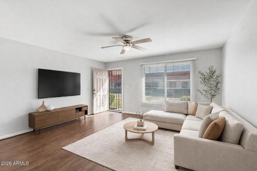 Available April 1! Effortless single-level living in the heart of Old Town Scottsdale. This beautifully updated 2-bedroom, 2-bath split floorplan townhome features hardwood flooring throughout and elegant French doors, all just steps from Chaparral Park.The kitchen is crisp and modern with white cabinetry, quartz countertops, stainless steel appliances, upgraded lighting, and RO water filtration. The expansive owner's suite offers a brand-new spa-inspired bath with a walk-in rain shower and TWO walk-in closets. The second bedroom is well-sized with a fully remodeled guest bath; ideal for guests, a roommate, or a refined home office.Enjoy a large private covered patio, two covered carport spaces, and an additional storage unit.