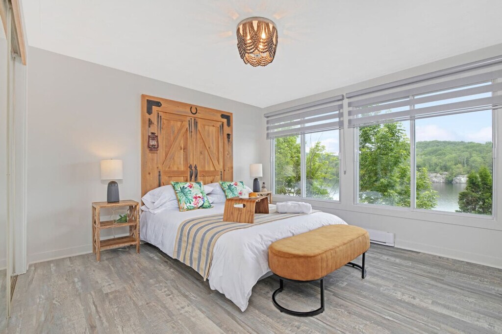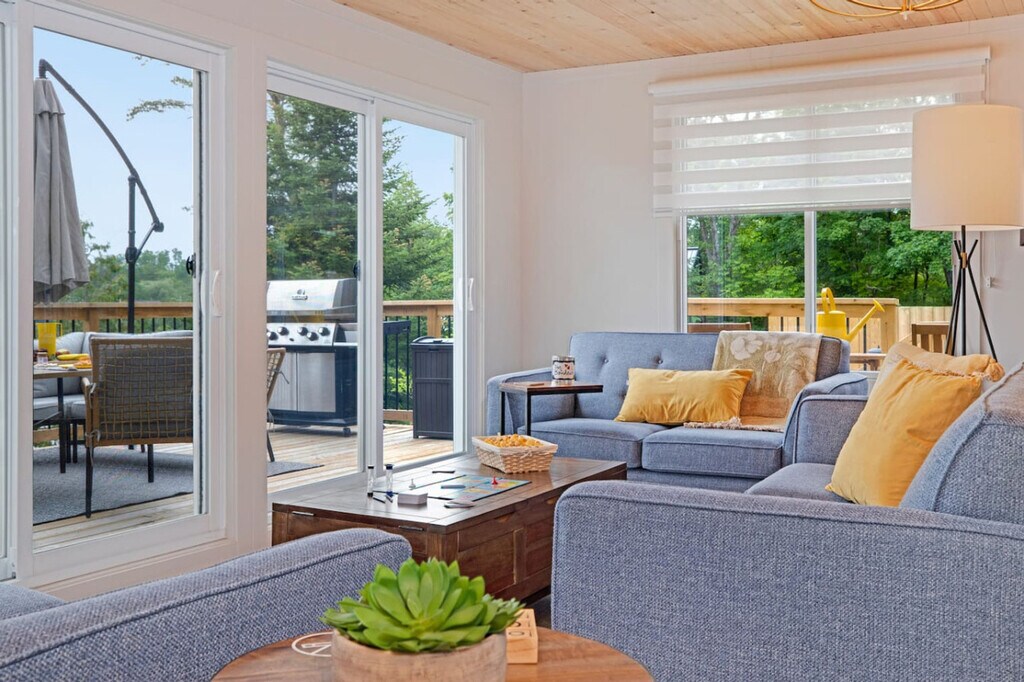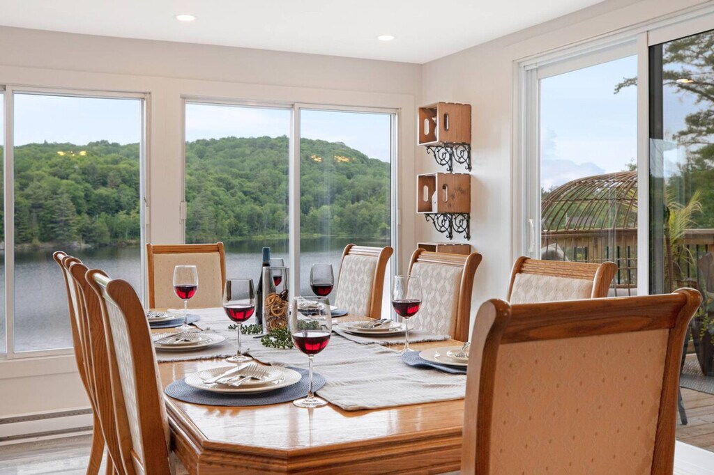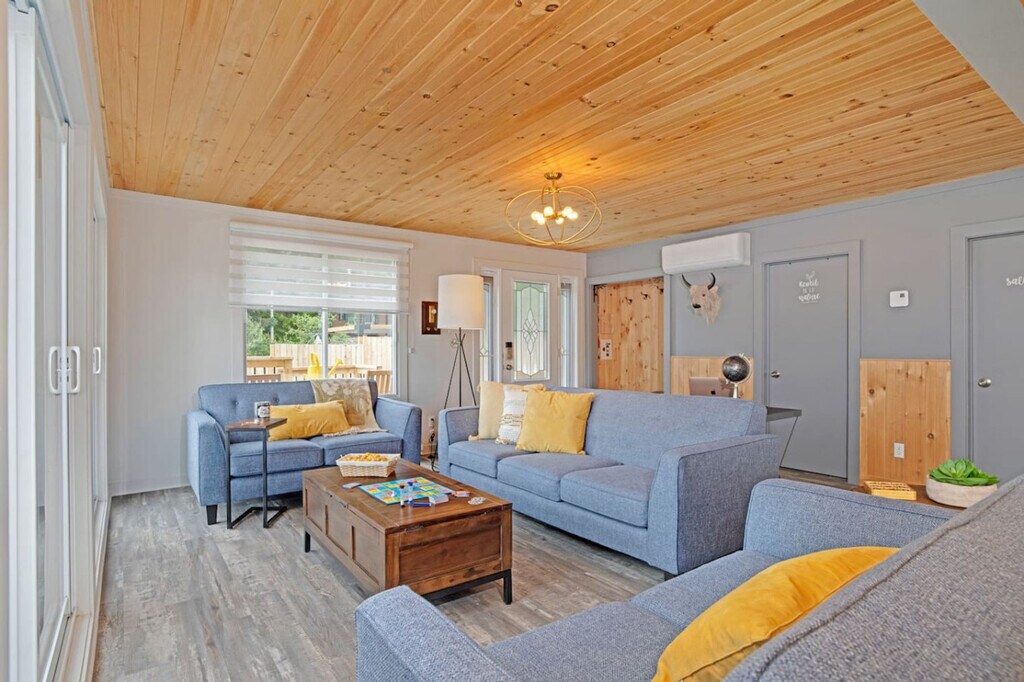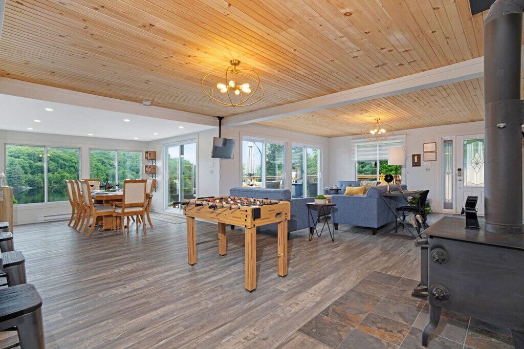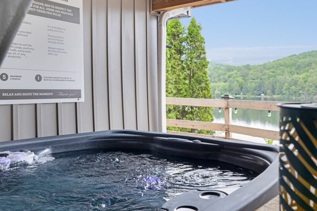 Welcome to Twin Lakes Retreat, a serene 4-bedroom cottage with breathtaking panoramic lake views. Thoughtfully designed for comfort, feel at home in this getaway. This home is fully equipped and features a spacious living room with a Smart TV, panoramic lake views, and direct access to the deck. Enjoy the fully functioning fireplace, ideal for cozy evenings, and a dining room with seating for 8, featuring stunning lake views and deck access. The fully equipped kitchen includes a dishwasher and all essential cooking and baking supplies. Complimentary coffee and tea are always provided. For entertainment, there is a foosball table, tons of board games, and a Smart TV for streaming your favorite shows and movies. The large deck has a seating area and BBQ grill, perfect for dining alfresco, and a 5-person hot tub to relax and unwind while soaking in the views. Enjoy the private sandy beach, large dock with lake toys including kayaks, paddleboards, and life jackets, and a navigable lake for adventures on the water. There is also an outdoor firepit with firewood provided for evenings under the stars and a picnic table by the lake for scenic meals. Enjoy the lake with complimentary kayaks and paddleboards. This property offers breathtaking views, modern amenities, and direct access to nature’s playground. This is a quiet, residential area. No outdoor music, yelling, or disruptive behavior is allowed at any time. Only registered guests (max 8 people, 4 vehicles) are permitted on the property and no outside visitors or parties are allowed. Violations of these rules, especially regarding noise or unauthorized guests, may result in a $150 fine and possible eviction without refund. No pets are allowed at this property. Quiet hours are from 9 PM to 8 AM. Violation of noise rules may result in a $150 fine and possible eviction without refund. Smoking is strictly prohibited inside or on the property. Includes a dedicated workspace for those who need to stay connected. Guests can access every space. The unfinished crawlspace/basement is kept locked but can be accessed to access the well pumps and electrical panel if needed. [SI]