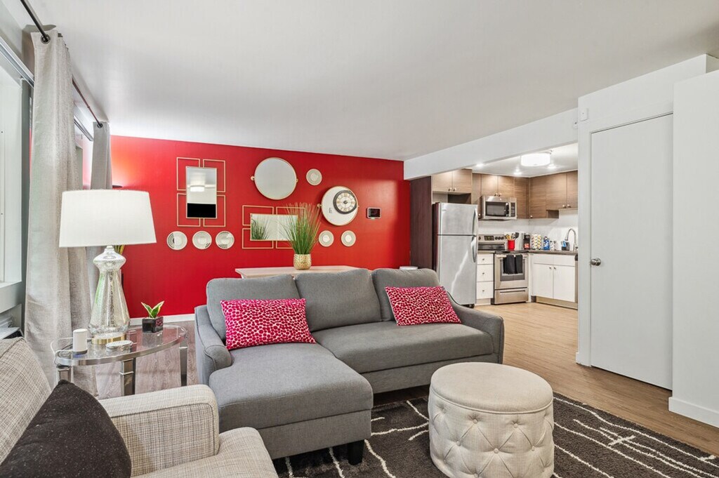 This gem is just minutes from Downtown Bellevue, making it a prime location for anyone working or visiting the Bellevue or Seattle area. The apartment is near prime shopping, restaurants, parks, attractions, and main freeways. Perfect for the traveling medical or corporate professional, this space is ready for you to come with just your bags and have everything you need already waiting for you. Enjoy your time and relax here with us. Perfect for traveling professionals and corporate relocations, this stylish downtown Bellevue apartment is your home away from home, fully furnished and equipped for extended stays. Located just 0.8 miles from downtown Bellevue and 9.9 miles from Seattle, you'll have everything needed for a productive and comfortable stay. The apartment features a king bed with luxury linens for restful sleep, a stylish chaise lounge sofa, a keyless entry system for seamless check-in, an in-unit washer/dryer, and a private furnished patio for relaxation. The fully equipped kitchen includes full-size stainless steel appliances, a Keurig coffee maker, modern conveniences like a rice cooker and air fryer, and complete cookware and utensils, perfect for meal prep during extended business stays. Free parking is available with a designated carport space, which is rare in the downtown area. The apartment is pet-friendly with two off-leash dog parks in the community. On-site additional laundry facilities are available for larger loads for a small fee. Restocking of supplies may be available for an additional fee. Located in the prime Bellevue business district, the apartment is 0.8 miles to Downtown Bellevue corporate offices and within walking distance to major employers and business centers. It's a 15-minute walk to Bellevue Transit Center with direct routes to Seattle and a 10-minute walk to Bellevue Square Mall for shopping and dining. With easy access to I-405 and I-90, it's ideal for regional commuting. The apartment is 9.9 miles to Downtown Seattle, 9.8 miles to Lumen Field and T-Mobile Park, and 15 miles to SEA-TAC Airport. Multiple bus routes stop directly outside the complex, making it ideal for medical professionals working at Seattle hospitals. Neighborhood highlights include Downtown Park, Bellevue Botanical Garden, Bellevue Arts Museum, and Lake Sammamish recreation areas, all within a short distance. The apartment features smart lock technology for flexible arrival times and 24/7 digital support through messaging. A digital check-in guide is sent 48 hours before arrival, and building security includes controlled access. On-site laundry rooms for larger loads are available for a small fee. The staff respects your privacy and will not enter the unit during your stay unless requested for maintenance or emergencies. The seamless check-in process is designed to accommodate late arrivals after long travel days. The apartment includes a dedicated home office with a private workspace, high-speed fiber internet (1 Gig), Ethernet connection, and an ergonomic set-up designed for long work sessions. A 55" Ultra HD 4K TV in the living room and a 43" 4K TV in the bedroom with Roku and YouTube TV are also available. [SI]
