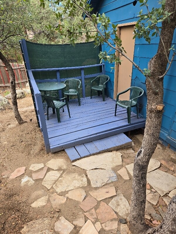 Property Id: 2246069 Peace in the Pines is located on a 3/4 acre property with pine trees. It is only 1 mile from downtown Prescott Courthouse and Whiskey R ow. Plenty of room for parking and enjoying the outdoors! Front and back patios with outdoor furniture included. Our home has knotty wood pine walls and floors making it very cozy! Furniture is brand new with a security system (cameras to the outdoors installed). Kitchen has new refrigerator, microwave, and coffeemaker with all plates, glasses, rice cooker, crock pot, utensils, pots, and pans that you would need for your stay. Bedroom is furnished with bedding and pillows. Bathroom is furnished with towels. Come take a look at this jewel in the pines and be delighted in your stay with us!