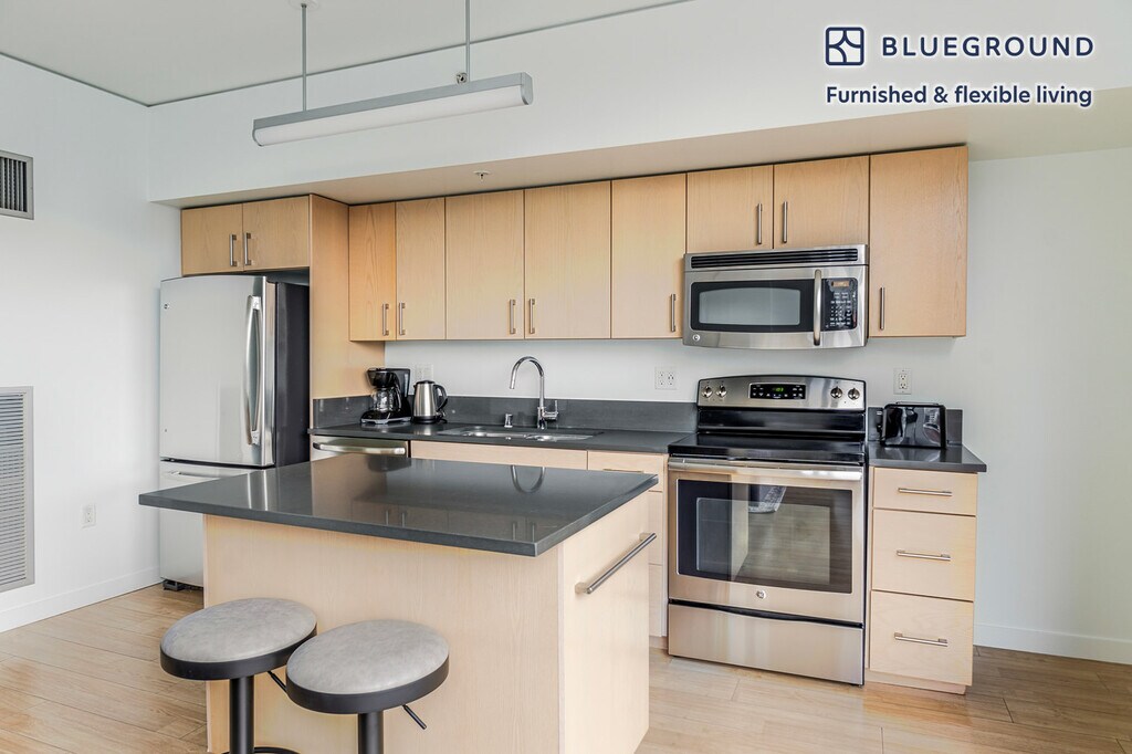 Feel at home wherever you choose to live with Blueground. You’ll love this cozy Pioneer Square furnished one bedroom apartment with its modern decor, fully equipped kitchen, and comfortable living room. Ideally located, you’re close to all the best that Seattle has to offer! (ID #SEA959) The advertised rate of $1,880/month is the lowest available price, based on a 2 month(s) and 23 day(s) stay with a move-in date of October 13, 2025. If you’re looking for a 1-year stay, the rate is $2,290/month. Rates vary depending on the duration of stay, season, and other parameters. For exact pricing and additional pricing components, please visit our website and enter your desired move-in and move-out dates. The rate is applicable when billed upfront; it can be higher if billed in multiple payments. Brokers are welcome to reach out. Were you looking for an unfurnished lease? Try Blueground instead and upgrade from unfurnished to furnished living: - Furnished at rates comparable to unfurnished - No setup or furniture costs - save thousands - Move-in ready - save time, just bring your suitcase Designed with you in mind Thoughtfully designed with bespoke finishes, modern furnishings, and a fully equipped kitchen, you’ll enjoy that “I’m home” feeling with this Blueground apartment. Whether you’re lounging in your sophisticated living room streaming the latest and greatest entertainment on the smart TV or premium wireless speaker, or getting some well-earned rest on the superior quality mattress with luxury linens, you’ll fall in love with everything this Pioneer Square apartment has to offer. This apartment also offers in-apartment laundry. Sleeping arrangements Queen Bed, 63in/160cm Amenities Building amenities unique to this one bedroom apartment include an on-site: - BBQ Area - Dryer - Elevator - Game room - Washing machine - Lounge - Media room - Parking - Pets allowed - Rooftop BBQ Arrival and ongoing support The entire apartment is yours to enjoy! Throughout your stay, you’ll have access to our Client Experience team through the Blueground App. You can schedule additional cleanings, submit maintenance requests, and view our neighborhood recommendations with just a few taps. We’ll share all details upon confirmation of your stay. Ideally Located This furnished apartment is located in Pioneer Square, known as Seattle’s first neighborhood.Internet companies, art galleries, coffee shops, bookstores, and trendy bars fill the Romanesque buildings. After a long day at the office, many like to unwind in secluded Waterfall Garden Park or grab dinner to go from one of the many food trucks at Occidental Square. The first skyscraper in Seattle, Smith Tower, is also located here, offering a 365-degree view of downtown. This historic neighborhood is accessible via bus, train, light rail, streetcar, and even water taxi or ferry. However, it's also considered to be one of the most walkable areas in all of Seattle. Other things to note Building amenities may have an extra cost. This Blueground apartment has flexible lease options, allowing you to book it for one month, a year, or more. Pets are welcome, though weight limits and breed restrictions apply and may incur fees. Parking is offered based on availability and is subject to a fee. We take great pride in ensuring every photo displayed is shot in our own units with our actual furnishings. That said, we regularly refresh our decor and furniture arrangement, which may differ from what’s pictured.