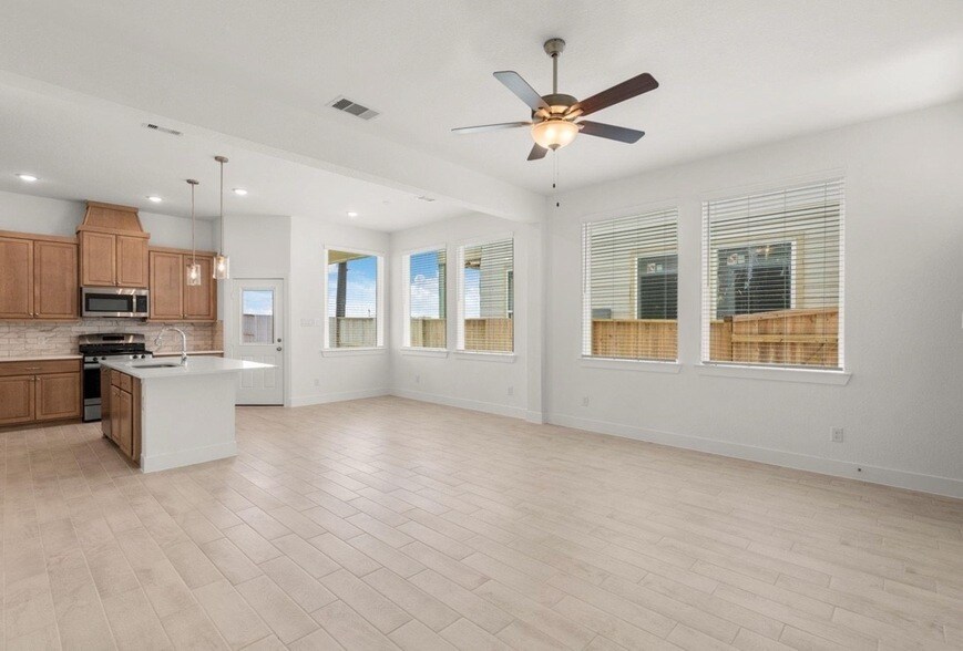 Stylish Townhome in Highly Desirable Meridiana! Beautifully maintained home featuring 3 bedrooms, 2.5 baths, and a versatile upstairs flex room. The open-concept first floor offers tile flooring, quartz countertops, stainless steel appliances, and warm Barley-colored cabinetry. Upstairs flex space is perfect for an office, playroom, or second living area. The spacious primary suite includes dual vanities and a large walk-in shower. Enjoy added storage, convenient utility space, and front yard maintenance included. Located in award-winning Meridiana with resort-style amenities including pools, lazy river, fitness center, parks, and walking trails. Available May 1st schedule your showing today!