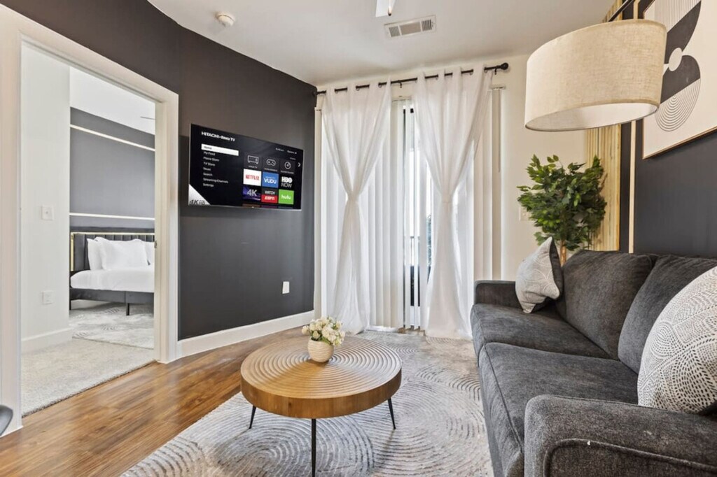 Discover modern luxury and feel at home in this newly updated 1-bedroom, 1-bath apartment in Frisco, TX. This residence offers a vibrant living experience and features an elevator. This newly renovated apartment features high-end furnishings and upscale decor, including granite countertops, kitchen islands, and stainless steel appliances. The fully equipped kitchen includes a coffee maker, electric kettle, and microwave. Enjoy the luxurious memory foam bed with premium bedding, a 50" smart TV with live cable and Netflix, in-unit laundry, and complete temperature control. Enjoy access to the backyard with a BBQ grill and outdoor dining area, a patio or balcony with sun loungers, free on-site and street parking, gym access, and an EV charger. Centrally located near Legacy West, this Frisco apartment offers easy access to shopping, dining, and entertainment options. Indulge in retail therapy at Stonebriar Centre, Legacy West, and The Shops at Legacy. Enjoy activities like golfing at Stonebriar Country Club, attending games at Dr. Pepper Ballpark, or cheering on your favorite soccer team at Toyota Stadium. It's also only 5 minutes from Legacy West and major employers such as Toyota, JPMorgan Chase, Ericsson, and PepsiCo. A strict no-party policy is enforced. Ring cameras monitor the entrance, and noise detectors are installed inside. Unauthorized guests at the unit or pool will incur a $100 fine per person. Smoking, drug, and vape use is not allowed inside the unit, on the balcony, or in the hallways of the building and will incur a $1000 fine. Quiet hours are strictly observed from 10 pm to 8 am, and parties are not allowed, including loud music, and will incur a $1000 fine if a party is discovered or if a neighbor complains of excessive noise. Pets must be disclosed and approved in advance, and no pets over 50lbs are allowed. If an excessive mess is discovered after your stay, you will be charged accordingly on top of the standard cleaning fee, and you will be charged for stained or damaged sheets/towels. There is a $600 penalty for lost keys/clicker/fob. Do not alter any safety device. There is one security camera pointing at the door entrance, and blocking or disconnecting this device will lead to immediate termination of your stay with no refund. Self-check-in and check-out are available. [SI]