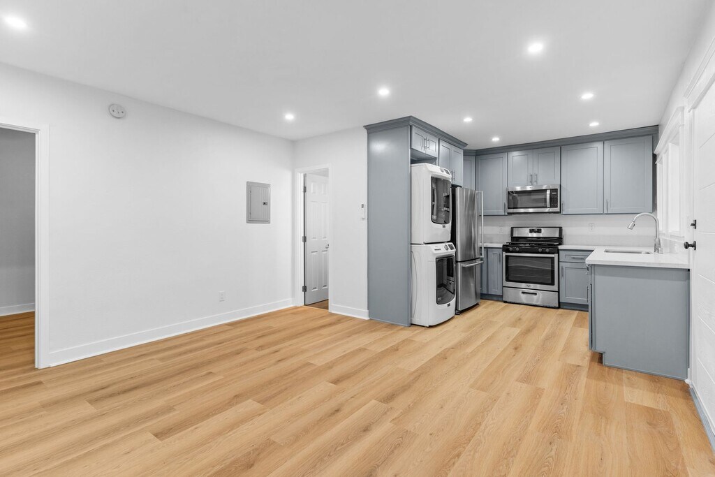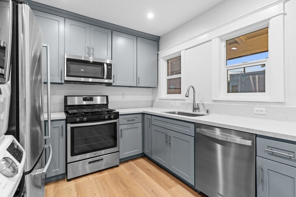 ***A/C and IN UNIT LAUNDRY*** Located in the East Village area of Long Beach, This Upper level 2 bed 2 bath with a true master beams with natural light. Featuring dual pane windows, in unit washer/dryer, A/C and warm wood tone vinyl plank flooring throughout. The kitchen is complete with quartz countertops, custom shaker cabinets, undermount sink and stainless steel appliances. Just minutes away from Shoreline village, Downtown Long Beach, Belmont Shore and Cal State Long Beach. Appliances include: Washer/Dryer, Refrigerator, Stove, Dishwasher and Microwave Parking available for additional fee **Renters Insurance Required** *Photos included on this listing represent a different unit at the property with similar features. Layout and some features may not be exact. Pictured furniture is for staging purposes only and are not included with the unit.* Must have verifiable rental history and income. No smoking. Ask about pets. No evictions please. This building is managed by a professional property management company. To submit an application: please visit our website at or call our offices at to schedule a showing. Nationwide Property Services Inc. does not and shall not discriminate on the basis of race, color, religion (creed), gender, gender expression, age, national origin (ancestry), disability, marital status, orientation, or military status, in any of its activities or operations.