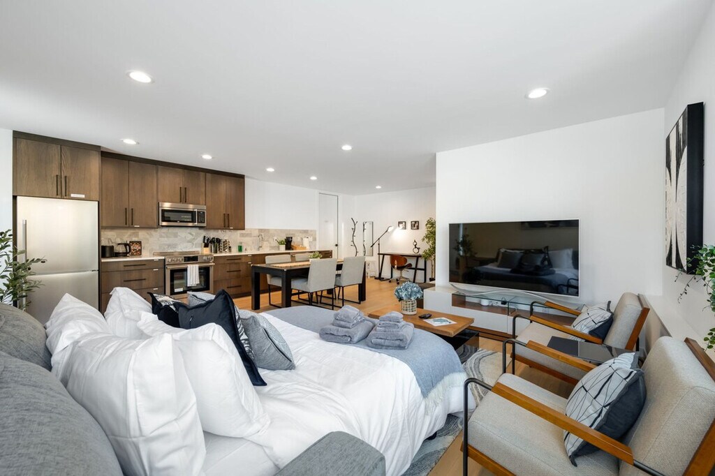 Brand new home in Seattle's top neighborhood, near U Village, Magnuson Park, and UW, with easy access to Park&Ride, downtown, and hospitals. This is a 1-bedroom, 1-bathroom suite on the first level of a larger single-family home. The living room has a sofa bed that can sleep an additional 2. Owners live upstairs, but the unit has utmost privacy with a separate entrance and a door locked between the first floor and the rest of the home. Welcome to this newly constructed guest suite nestled in Seattle's distinguished neighborhood! The suite includes air conditioning in both the bedroom and living room, a kitchen stocked with high-end appliances, cookware, silverware, servingware, spices, and a Keurig coffee and tea maker. All beds are outfitted with high-quality mattresses, linens, and a comfortable duvet. Onsite washer and dryer are available for your laundry needs, and there is free street parking. The regular nightly rate covers 2 guests. Additional guest fees are $25 per person per night, up to a maximum of 4 guests. The neighborhood boasts stunning views of Lake Washington and the Cascade Mountains, creating a picturesque backdrop for residents. View Ridge is enriched by the expansive Magnuson Park, providing abundant recreational opportunities, including sports fields, a dog park, and beach access. The nearby Sand Point Country Club adds a touch of exclusivity, while local shops and eateries in View Ridge offer a small-town feel within the city. With easy access to the University of Washington and downtown Seattle, this neighborhood is ideal for those seeking a serene, community-oriented lifestyle with the conveniences of city living. The best way to explore this area is by car, although bus stops within walking distance offer quick access into downtown Seattle. Guest access will be granted via a smart lock. This is not a pet-friendly home, with a $500 fine for unauthorized pets. Strictly no parties and events, quiet hours between 10pm-8am, no smoking or vaping of any kind anywhere on the property including outdoor areas, no digital piracy, and no shoes in the home. There is a $500 fine per violation. A laptop computer is not included. Registration Number: STR-OPLI-23-000877 [SI]