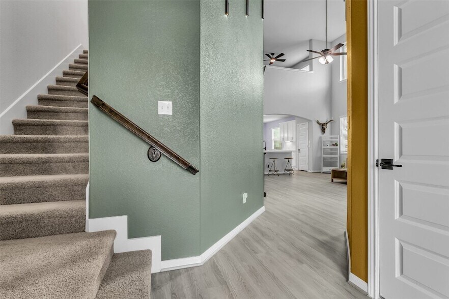 Welcome to 5338 CJ Walker in Sandrock Station. Meticulously maintained, this home shows like a model. A beautifully upgraded frosted glass panel entry door welcomes you and your guests into soaring 18 foot ceilings, abundant natural light, and luxury plank vinyl flooring, creating a bright and open feel throughout the main living areas. The open concept layout flows seamlessly into a modern kitchen featuring quartz countertops, 42 inch cabinetry, classic subway tile backsplash, a large island, breakfast bar, and a Dupure filtered drinking water system at the sink. Stunning custom wall and lighting accents elevate the space, and most lighting and fixtures throughout the home have been thoughtfully updated. Spacious bathrooms feature tile extended to the ceiling for a clean, elevated finish. Step outside to an entertainer s backyard retreat complete with a pergola and additional side pergola with bar area. Convenient access to Beltway 8, Hwy 288, and 610.