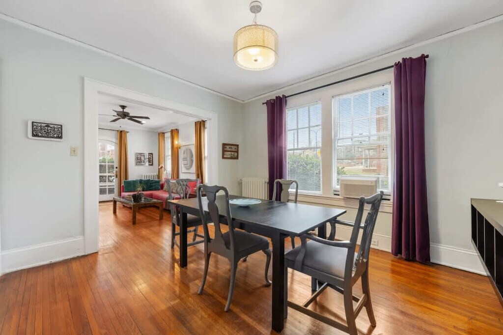 Relax and feel at home in this restored 1-bedroom condo in Charlotte’s historic Elizabeth neighborhood, set within the classic 1920s Hawthorne Building. This spacious first-floor condo blends timeless character with curated modern style. Inside, you'll find a king-size bed, a fully equipped kitchen with stainless appliances, roasting pans, and spices, and an in-unit washer and dryer. The living room features a comfortable sofa that converts to a bed and a Smart TV with Hulu Live TV. The bathroom offers modern tile, Nest bath products, and plush towels. Enjoy ultra-fast fiber Wi-Fi, ideal for work or streaming. Private on-site parking is available next to the building. An optional workstation with a 32" monitor, keyboard, and mouse is available for $10 per day. A pack ’n Play or high chair is available with 24 hours notice. Dogs are welcome for $59 per dog, with a fee of $120 if unregistered. Welcome to Elizabeth, one of Charlotte’s most beloved neighborhoods for tree-canopied streets, historic homes, and walkable local life. Walk to Independence Park and neighborhood cafés, or take the Streetcar to Uptown and Plaza Midwood. The CityLynx Streetcar is just 0.2 miles away, providing direct access to Uptown and Plaza Midwood. Novant Presbyterian Hospital is 0.4 miles away, and Uptown Charlotte is 1 mile away. Guests must be 21 or older, and ID verification is required. Quiet hours are from 10 PM to 7 AM. Smoking and parties are not allowed, and will incur a fee of $300–$500. Dogs are not allowed on furniture. Includes a table for four perfect for meals or remote work and ultra-fast fiber Wi-Fi ideal for work or streaming. [SI]