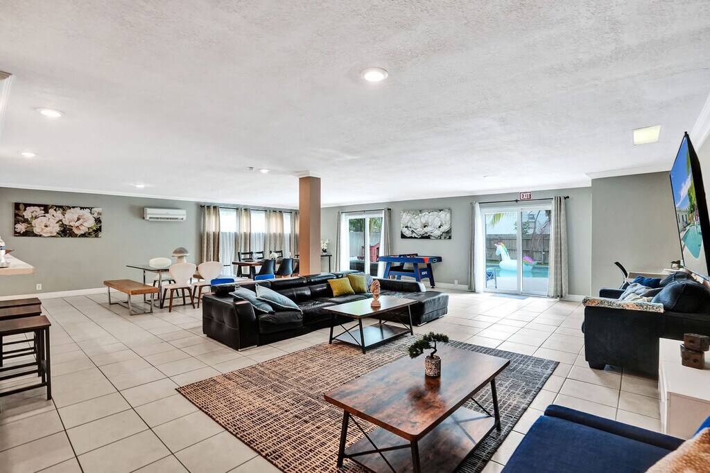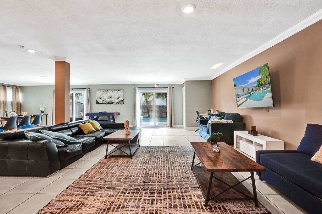 Nestled within the desired Hollywood area, this luxury family home is perfect for large groups, offering fun amenities to keep everyone entertained. The villa features a modern open-plan design, a large kitchen, four bedrooms with smart TVs, two work desks, air hockey, ping pong, a heated pool, a trampoline, a BBQ, and an outdoor lounge. Make your way inside this bright, sun-filled villa via the easy, keyless smart lock and feel instantly at home with everything you could need for a comfortable stay as you relax and soak up the endless Florida sun. The spacious living area provides the ideal place to gather for a movie night on the large chaise lounge, which can also be converted into two comfortable queen beds for additional guests. Enjoy your morning coffee at the sleek stone breakfast bar or sit together for meals at the stylish dining table set for eight. The modern, gourmet kitchen comes fully equipped to cook anything from a stack of pancakes to a three-course meal for the family, complete with a coffee bar for your morning fix. The villa also offers in-unit laundry facilities. There is free parking in the home’s driveway that fits up to four cars. The daily fee for using a heater for the heated pool is $40 per day. Pets are welcome with an additional fee. Early check-in and late checkout may be available for a fee. Located in the picturesque Hollywood Hills, just 15 minutes from beautiful beaches and minutes from Hard Rock Casino, this villa serves as a great central base. Explore unique shopping, beachfront restaurants, and bars along Hollywood's Boardwalk, in addition to fun family activities and live music. The convenient trolley service is available to take you to and from Hollywood Beach to Downtown Hollywood, making it easy to experience everything the city has to offer. The Hollywood Beach Boardwalk stretches nearly 2.5 miles along the Atlantic Ocean, offering a brick-paved thoroughfare for pedestrians, joggers, bicyclists, and rollerbladers. Nature enthusiasts will love the Anne Kolb Nature Center and the Everglades Holiday Park, both offering incredible experiences. Shopping options abound with the Galleria Mall, Las Olas Boulevard, Sawgrass Mills Outlet, Gulfstream Park, and Bal Harbour Shops nearby. When it's time to refuel, countless restaurants are less than a mile away, or enjoy drinks with a view at the many cafes and bars lining the boardwalk. Quiet time starts at 10pm out of respect for the neighbors as this is a quiet community. Unauthorized gatherings or events will incur a $3000 party fee. Smoking is allowed outside only, and a $150 fee plus the cost for smell removal treatment will be applied if the house smells like smoke or for cigarette butts. Check-in is at 4pm and check-out is at 10am. You can self-check-in any time after 3pm with a code. No on-street parking is allowed, and no parties or drugs are permitted. The pool is maintained on Friday mornings, subject to weather conditions. The villa includes two work desks, making it remote work-friendly with high-speed Wi-Fi available throughout the home. [SI]