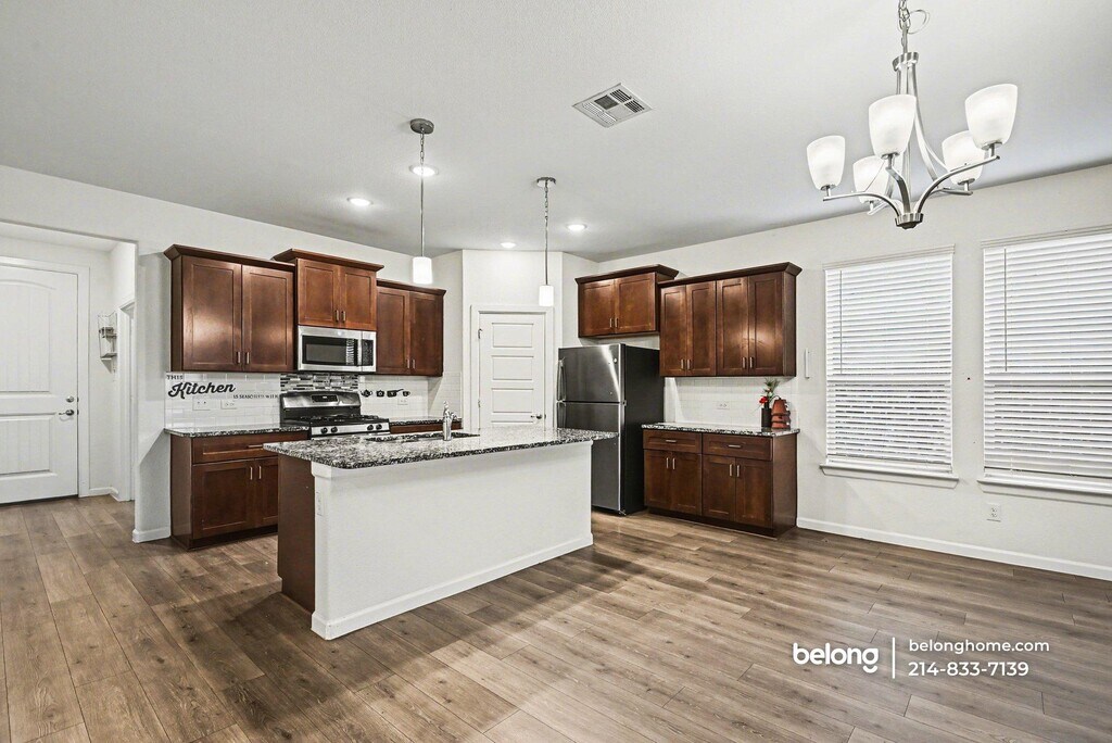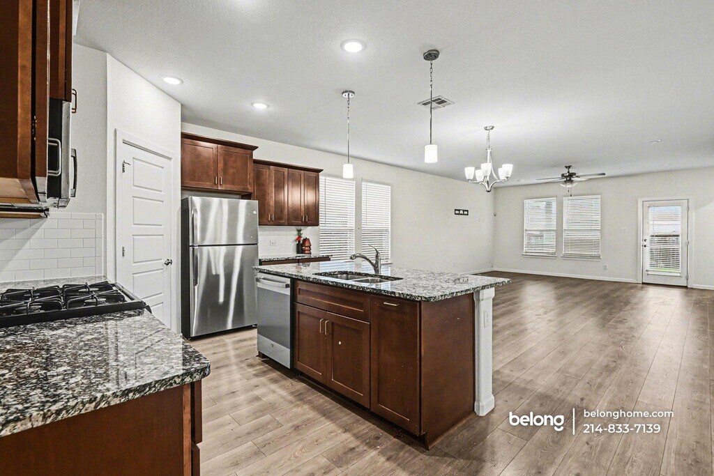 Set in a welcoming Haltom City neighborhood, this spacious four-bedroom, two-and-a-half-bath home offers 2,700 square feet of thoughtfully designed living space. A crisp exterior with a bold blue entry door and attached garage creates a striking first impression, while the fenced backyard delivers plenty of room to relax, garden, or entertain. Inside, an open-concept main level pairs rich wood-look flooring with abundant natural light. The kitchen stands out with dark shaker cabinetry, granite countertops, stainless steel appliances including a gas range, and a generous island with pendant lighting. It flows seamlessly into the dining area and a sunlit living room anchored by a modern chandelier and ceiling fan, making everyday living and hosting effortless. Upstairs, the primary suite provides a quiet retreat with plush carpeting, an en-suite bath featuring a dual vanity, tiled walk-in shower, and a dedicated walk-in closet. Three additional bedrooms and a full secondary bath give everyone space to settle in, while the attached garage and interior laundry add everyday convenience. Tucked into a family-friendly pocket of Haltom City, the location balances quiet residential streets with convenient access to schools, shopping, dining, and major commuter routes heading into Fort Worth. *Our homes come as-is with all essentials in working order. Want upgrades? Request it through the Belong app, and our trusted pros will take care of the rest!