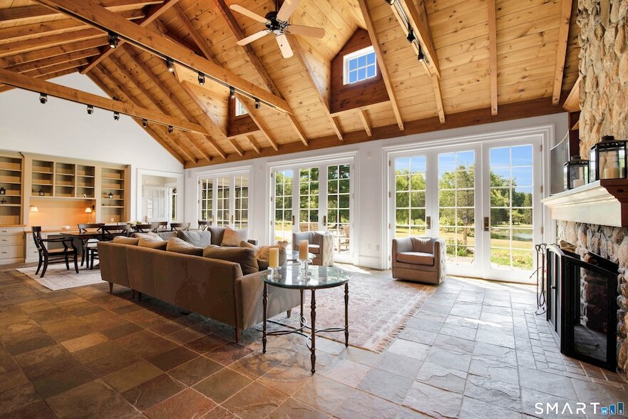 Welcome to this extraordinary stone and shingle country estate, nestled on 70 acres of private retreat. This property boasts spectacular western views, ponds, a greenhouse, and a horse barn. The meticulously crafted residence showcases exquisite taste, featuring high-end finishes and top-of-the-line appliances in the granite chef's kitchen, which is complemented by a butler's pantry and a spacious dining area. The formal dining room, captivating great room, and elegant living room feature soaring ceilings, slate floors, and two impressive stone fireplaces that stretch from floor to ceiling. With 7 generous bedrooms and 5.2 bathrooms-including two screened-in sunrooms, ample French doors, and Palladian windows-this home is filled with natural light throughout. Step outside to take in breathtaking views from the expansive slate patio and large deck, perfect for entertaining or quiet relaxation. The finished lower level provides additional living space with a full kitchen and two mudrooms-one with a separate laundry area, shower, and wash sink-offering both functionality and luxury. Truly a hidden gem designed for refined living. Schedule your private tour today and discover this unparalleled estate. See agent-to-agent remarks for additional details. Short-term rentals only: $3,500/day with a minimum 5-day booking and a maximum lease term of 28 days. Tenant is responsible for paying a 16 percent short-term rental tax. You can also lease house without horse farm around 3 acres.