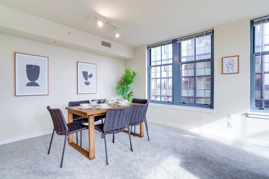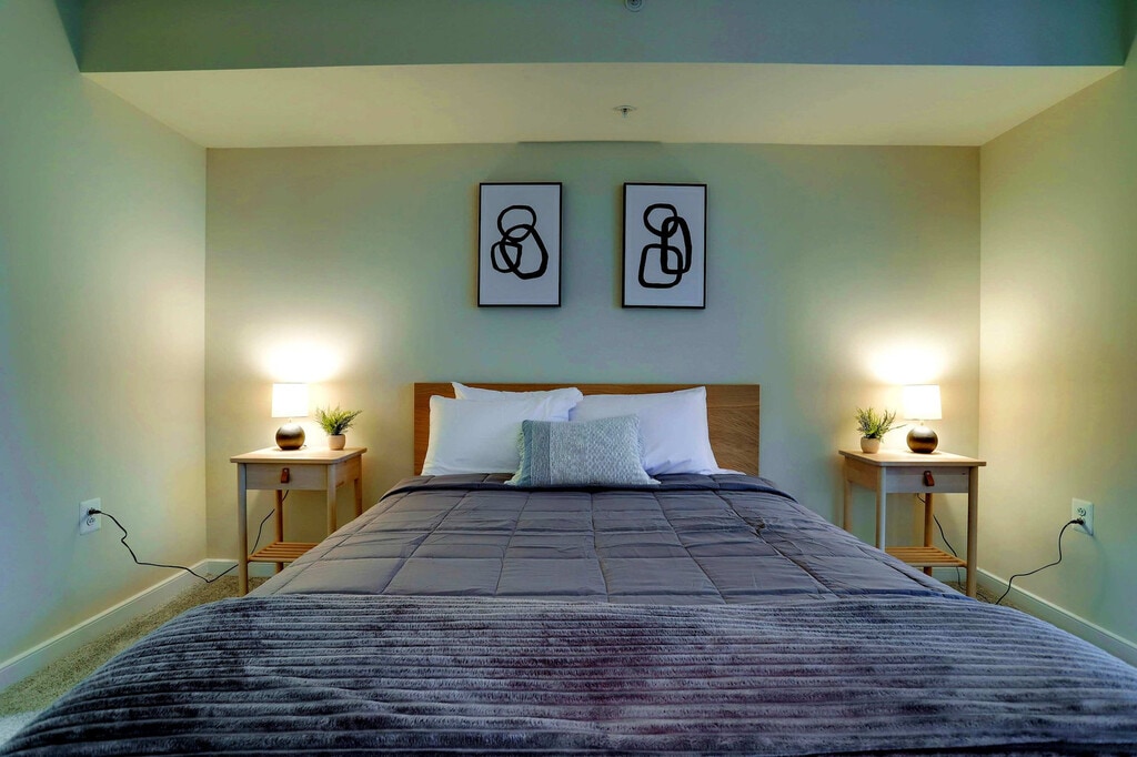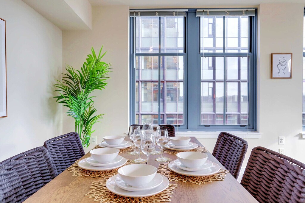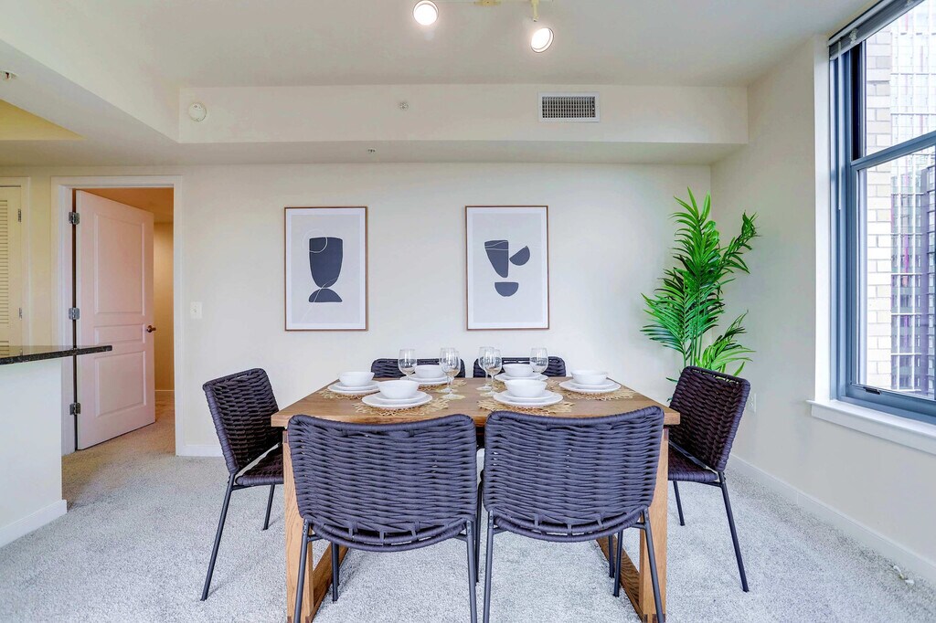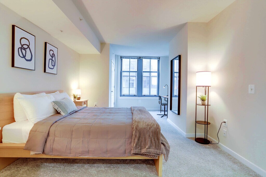 Feel at home in this stylish 2-bedroom apartment in the heart of National Landing, your perfect home base for exploring Arlington and Washington, D.C. Step into this bright and modern 2-bathroom apartment, thoughtfully designed for comfort and productivity. The serene master bedroom features an en-suite bathroom with a relaxing tub. The second bedroom is a cozy and private space with direct access to the second bathroom. The comfortable living area is a welcoming space with a TV. The kitchen is fully equipped with modern appliances, a dining area, and all the essentials you need. This apartment includes a washer and dryer and high-speed Wi-Fi for a hassle-free stay. This apartment is in the heart of National Landing (Pentagon City), a vibrant and well-connected neighborhood perfect for both business and leisure travel to the D.C. area. You are steps from premier shopping at Fashion Centre at Pentagon City and just two Metro stops from D.C.'s National Mall and Smithsonian Museums. Surrounded by top-rated local dining, you can enjoy wood-fired pizzas at Matchbox or authentic Thai at Thaiphoon. For fun bars and nightlife, visit Siné Irish Pub for an authentic pub atmosphere, Bonefish Grill for signature hand-crafted cocktails, or The Commentary Social House for creative cocktails. You are just a short walk from the Pentagon City Metro Station, putting all of D.C.'s landmarks at your fingertips. The Reagan National Airport (DCA) is just one Metro stop away, making for a stress-free commute. You are right next to the iconic 18-mile Mount Vernon Trail, perfect for a scenic bike ride, run, or walk along the Potomac River. For your convenience, a large and well-stocked Harris Teeter supermarket with a pharmacy and Starbucks is located right at Pentagon Row. For the safety and security of all residents, the building requires a brief guest screening prior to check-in, which must be completed before arrival. The building operates a centralized HVAC system in accordance with municipal regulations. Heating runs from October 13 to May 1, while air conditioning is available from May 15 to October 1. During seasonal transitions, HVAC adjustments are managed by the building association based on outdoor temperatures. In case of damage not covered by the damage waiver fee, the following will be charged: lost FOB/access cards: $250 (this is what the building charges to replace them), smoking inside is charged a $300 fine, and a party on the property is charged a $300 fine. The master bedroom features a dedicated desk. [SI]