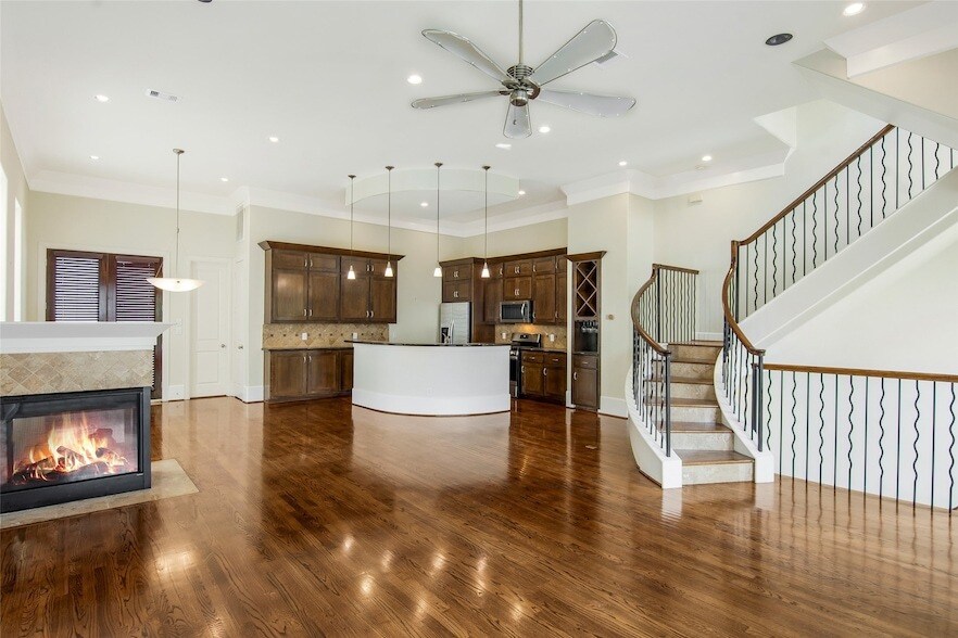 MEMORIAL PARK AREA, IN VIBRANT RICE MILITARY! A CONTEMPORARY 3 BED, 3.5 BATH FREESTANDING HOME WITH AMAZING DOWNTOWN & PARK VIEWS FROM THE MASSIVE 4TH LEVEL ROOFDECK PLUS 360 DEGREE CITY VIEWS ON THE 5th SKYDECK. DESIGNED BY AWARD WINNING JETALL, IT SHOWCASES FLOOR TO CEILING WINDOWS, 12 FT CEILINGS & STUNNING CUSTOM STAIRCASES. UPGRADED QUALITY FEATURES INCLUDE 8FT SOLID DOORS, MAPLE CABINETRY, GRANITE COUNTERS, KOHLER FIXTURES; STAINLESS STEEL APPLIANCES & BUILT-IN WINE BAR, A CHEF'S DELIGHT KITCHEN. THE 2ND FLOOR OPEN LIVING & DINING CONCEPT HAS FULL & JULIET BALCONIES. THE GATED FRONT PATIO RECENTLY LANDSCAPED FOR PRIVACY, OPENS TO A LARGE FOYER & BEDROOM WITH EN-SUITE BATH. LOOK NO CARPET HERE:HARDWOODS & TILE FLOORS THROUGHOUT! THE SPACIOUS 3RD FLOOR PRIMARY BEDROOM RETREAT HAS FIREPLACE, EXECUTIVE BATH, WHIRLPOOL TUB, GLASS SHOWER, RAINFALL SHOWERHEAD; DOUBLE VANITY & GREAT WALK-IN CLOSET WITH CUSTOM SHELVES. BEDROOM THREE, ALSO ON LEVEL 3 WITH ENSUITE BATH. MOVE IN READY TODAY!