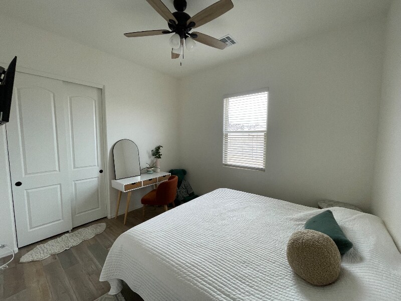 Property Id: 2347524 Furnished room with private bathroom in a quiet home nestled among the foothills of the White Tank Mountains in the West Valley of Phoenix. The home is only 2 years old and features 10 ft ceilings and modern fixtures. Kitchen, dining and living room are all shared spaces! I want you to feel right at home! I do have four older and very friendly dogs that can’t wait to meet you.