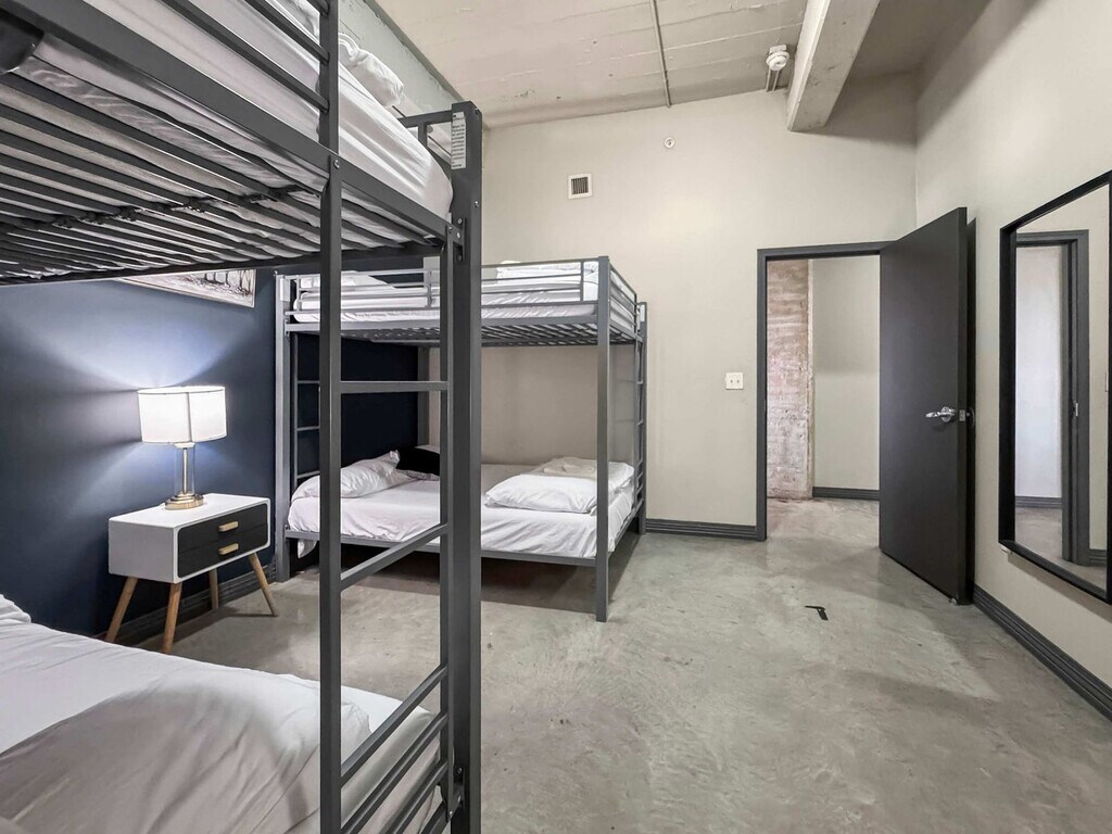Feel at home in this chic 1-bedroom, 1-bath urban retreat with stunning Downtown Dallas views. Ideal for families or small groups, it features two full-size bunk beds, a king-size bed, and a sofa bed. Enjoy a bright living area with a 58” smart TV and a fully equipped kitchen. Additional amenities include self check-in with smart lock, washer and dryer access, iron and ironing board, and a heating and cooling system. Free parking is available for one vehicle (valet service included) on-site; additional vehicles may park nearby, subject to availability. Pets are welcome with prior approval and are subject to a cleaning fee based on the length of stay: $25/night for stays of 1–4 nights, $200 per pet for stays of 5–29 nights, and $300 per pet for stays of 30+ nights. Please request approval before booking to avoid any issues. Located in the heart of Dallas, this apartment offers the perfect balance of city excitement and neighborhood charm. You’ll be minutes from Downtown Dallas, the Arts District, and Deep Ellum, known for its vibrant nightlife, live music, and trendy dining spots. Nearby, you’ll find cafes, boutiques, and parks ideal for a morning walk or coffee run. Major attractions like Klyde Warren Park, Dallas Museum of Art, and American Airlines Center are just a short drive away, making it easy to explore everything the city has to offer. Getting around is easy and convenient from this centrally located Dallas location. Most major attractions are within a 5–10 minute drive, and rideshare services like Uber and Lyft are readily available. For public transit, the DART rail and bus stops are nearby, offering quick access to Downtown and surrounding neighborhoods. Walk to local cafes, shops, and restaurants just minutes from your stay. Oversized vehicles are not permitted in the parking garage and will be denied entry at check-in in accordance with building regulations. Hallway cameras operate in common areas. A noise monitoring device is installed inside the unit (monitors sound levels only, not conversations). Includes an ergonomic workspace with desk and chair and high-speed Wi-Fi. [SI]
