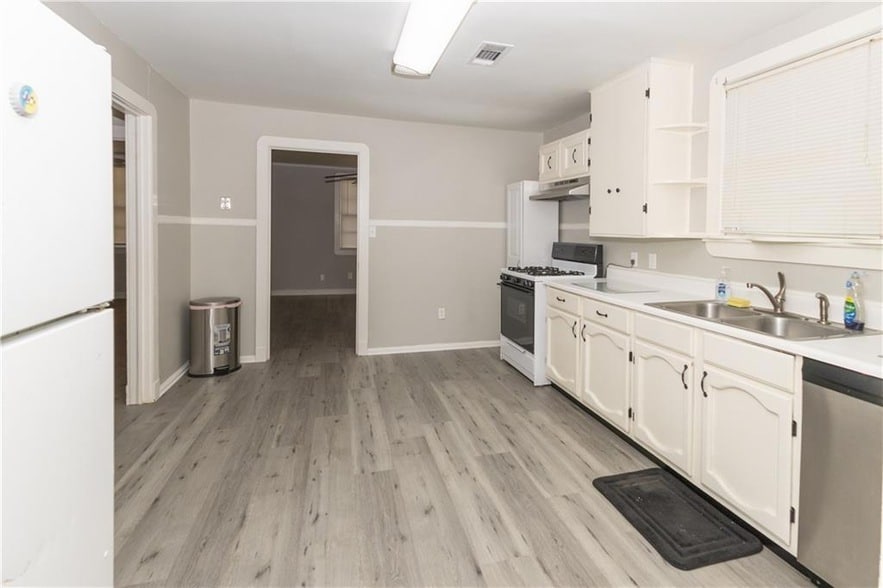 Spacious freshly painted inside and out 2 Bedroom, 1 bath home with large laundry room on oversized corner lot. House sits on 4 Lots and has large bedrooms. All appliances pictured included. New floor kitchen, laundry, bath, hall, living room. Tenant pays for gas, electric, water, lawn-care and trash.Owner is not allowing pets at this time.