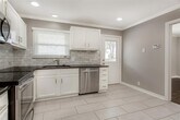 Charming 2 bedroom, 1 bath home in Lake Highlands! Kitchen appliances are all stainless steel, including a refrigerator, dishwasher, electric range, electric oven, and microwave. Black granite counters with subway tile backsplash. New thermal windows. Recessed lighting in living, dining, and kitchen. Hardwood floors throughout and ceramic tile in bathroom and kitchen. Double vanities in bathroom. Full size washer and dryer connections in hallway. 2 car detached garage with an opener. Fenced in backyard. Storage space connected to garage belongs to owner. No pets over 35lbs. Don't miss this one!