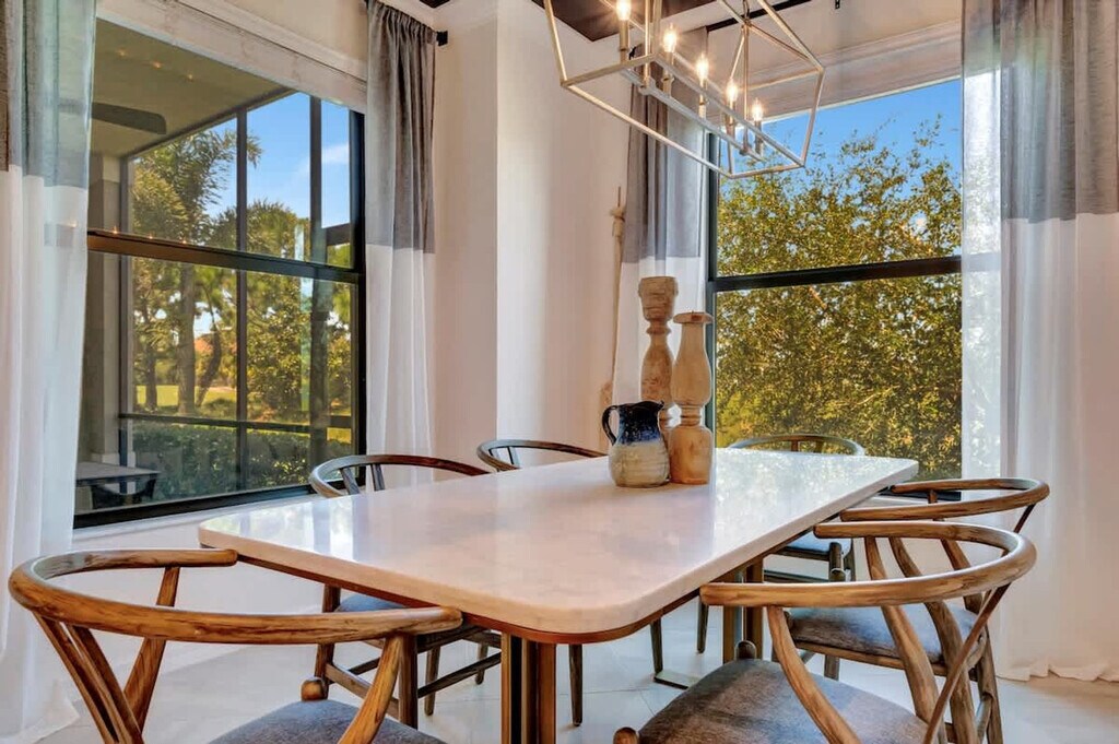 Feel at home in this upscale 2-bedroom, 2-bathroom ground-floor townhome at Palmer Circle, beside the tee box of Piper Hole #10 at Lakewood National Golf Club. This 1,336 sqft home offers luxury interior finishes, handcrafted furniture, and plenty of sunshine. This former Lennar model home features the upgraded D’Angelo floorplan, designer ARHAUS furniture, elegant custom finishes, and floor-to-ceiling charm. The open-concept kitchen features modern appliances, custom lighting, paint, and granite countertops. Enjoy access to 8 tennis courts, 4 pickleball courts, bocce ball courts, and a state-of-the-art 24-hour gym, spin studio, sauna, and steam room. To access the amenities, including the golf course, a $642 amenity fee is required. For stays of 4 months or longer, the fee is $300. Additional parking passes can be purchased for $25 each. Located in a gated community in Lakewood Ranch, this townhome is steps from the Arnold Palmer-designed golf course and within walking distance of the Lagoon Pool, Spa, Fitness Center, and Restaurant. Quiet hours are between 10 PM and 8 AM. Guests must sign a digital rental agreement and provide a legal, valid ID with a verification photo before arrival. A maximum of 5 people are allowed. All transactions, including refunds, will incur a 3.7% processing fee applied by our payment processor; this fee is not refundable. [SI]