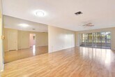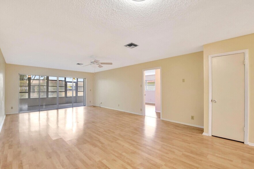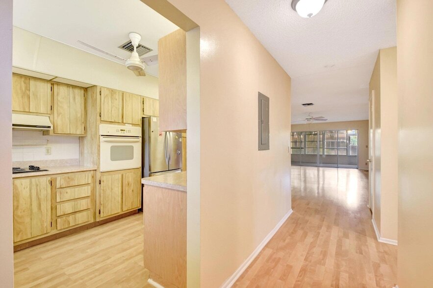 Fernley III is a 55+ no-pet community featuring a clubhouse, pool, and tennis with a 15-20 minute drive to the beach and surrounded by major shopping plazas.. This corner unit villa offers a master bedroom with walk-in closet and guest bedroom with floor to ceiling closets. The kitchen has additional counter space and cabinets for extra storage. The guest bathroom has been partially updated with new vanity, toilet, & sliding glass door with both bedrooms has updated tile. AC from 2011. Master bathroom has updated vanity & toilet with tub and sliding shower door. The patio area is enclosed with plastic windows and screens for that Florida outdoor experience. Washer/dryer are included in the rent and located in the utility room with the water heater 2005.