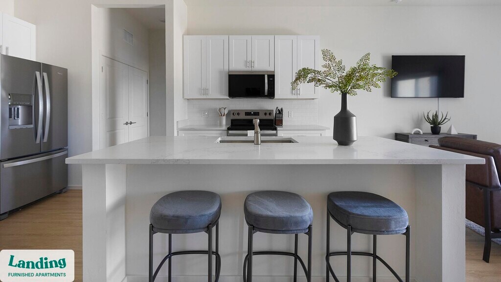 Landing offers flexible lease terms from weeks to months. Please always visit our website or contact us for the latest pricing & availability. Stay longer, save more: 6-Month Minimum base rent: starts at $2399/mo 12-Month Minimum base rent: starts at $2027/mo Landing offers flexible leases across a network of over 35,000 fully-furnished apartments throughout 375+ cities so you can rent on your terms, practically anywhere, and avoid the hassle of paying deposits or application fees. Visit to learn about all the benefits of a Landing membership, see our competitive up-to-date pricing, explore available apartments, take virtual tours, and make reservations online without jumping through traditional rental hoops. Landing's apartments at Aerie La Cholla are designed for comfortable, easy living, with the ability to stay as long as you like. Experience living with Landing Every apartment is outfitted with all the modern essentials including: custom-designed furnishings, a fully-equipped kitchen with deluxe stainless steel appliances, a gourmet coffee maker, premium linens, Smart TVs, and incredibly fast, reliable internet for working from home. When you live with Landing, you'll enjoy a hassle-free experience with the added benefit of 24/7 access to our dedicated member experience team. Some of the nitty-gritty: a background check and proof of income are required; we're completely smoke-free; bundled utility packages and pricing vary based on length of stay; pet-friendly options available; listed price reflects a 12-month minimum stay.
