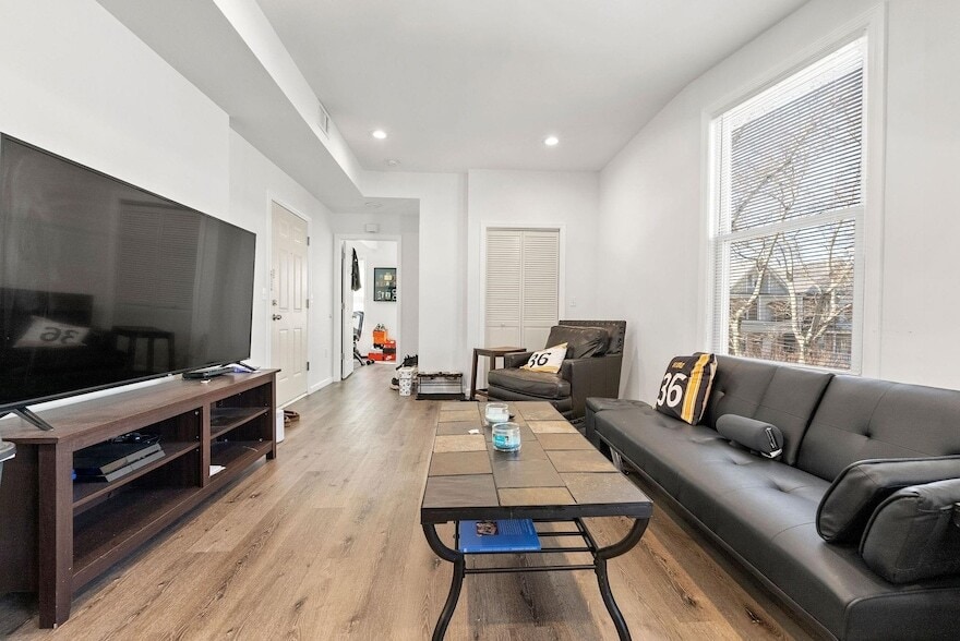 This is the apartment you've been looking for! Beautiful, modern and well a pointed renovation down to the last detail. Featuring two generous sized bedrooms with a bonus room, two full baths anchored by hardwood floor throughout the apartment and bonus in-unit washer/dryer for your convenience. The kitchen is adorned with granite counter-tops, stainless steel appliances including dishwasher and microwave. Rest easy with exterior security cameras and gate. Backyard is shared among tenants. Location is close proximity to bus stops, light rail station, NJ Turnpike, routes 95, 78 and 1/9. Parks, houses of worship, eateries, shopping and more.