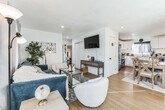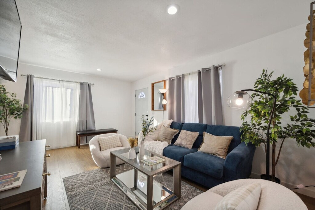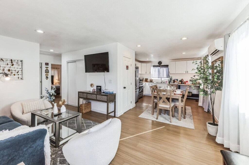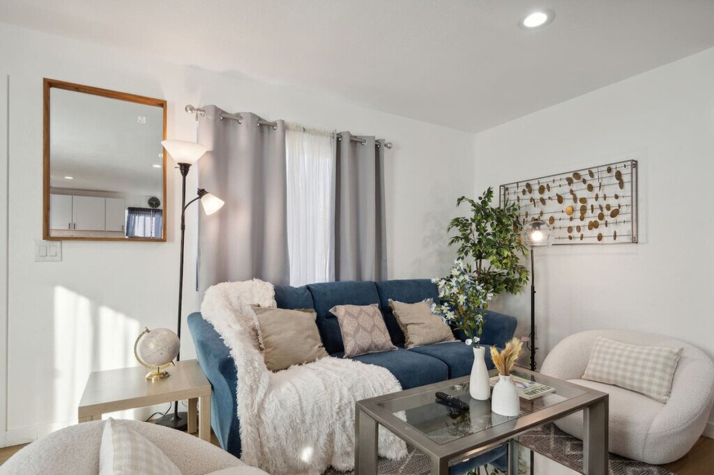 Welcome to this modern 3-bedroom, 1200 sqft home in San Diego, complete with driveway parking for one car. Feel at home in this inviting space, ideally located just 5-10 minutes from shopping centers and local restaurants. The fully equipped kitchen caters to all your culinary needs, featuring a gas stove and oven, blender, toaster, cooking pans, baking trays, and essential supplies like coffee, oil, sugar, and salt. Modern appliances, including a coffee machine, microwave, and fridge, make it perfect for those who love to cook and dine in comfort. Enjoy your meals at the dining tables and chairs inside the home. The air-conditioned living area boasts flat-screen smart TVs with cable and streaming services, ensuring entertainment for everyone. Pets are welcome in this home. The massive gated yard offers a secure space for your pets and kids to play and explore. Driveway parking is available for one car, providing easy access and peace of mind. Situated in a convenient location, this home is just a short drive from shopping centers and local restaurants, making it easy to explore the best of San Diego. For accurate distances to specific locations, use Google Maps with the address 'Greycourt Ave, San Diego, CA 92114'. This home features a private entrance and gated backyard, ensuring privacy during your stay. Self-check-in is available via lockbox or keypad, with instructions sent at noon on your check-in day. Early check-in or late check-out is available for a small fee. Please be mindful of noise levels to avoid neighbor complaints. Any noise violations may incur a $1000 penalty. Unauthorized guests or pets will incur a $100 per night penalty. Late check-out without prior approval will be fined twice the nightly rate. Please report any damages or issues immediately and dispose of trash in provided bins to avoid overflowing. No illegal activities or food in bedrooms are allowed. Lock all windows and doors when leaving the suite. For those working remotely, the home offers a choice of desks and chairs both inside and outside, along with 500Mbps Wi-Fi, making it easy to host online meetings or share large files with clients or colleagues.