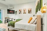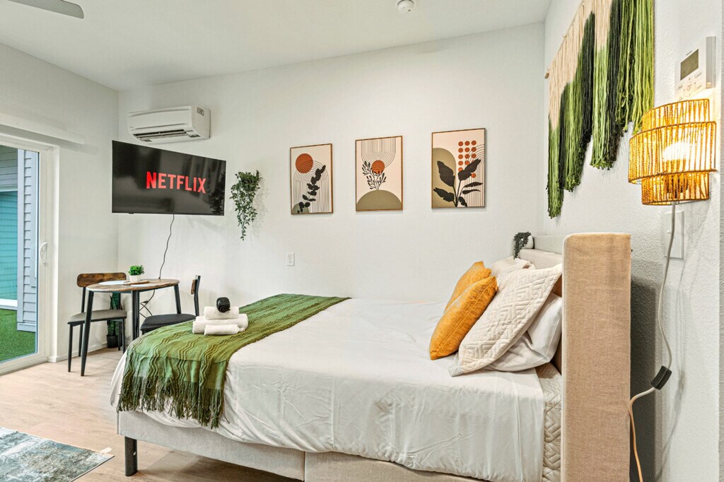 Feel at home in this cozy boho suite, just steps from Bishop Arts. This newly furnished suite offers a comfortable and modern escape. This suite features a queen bed with a luxury mattress and fresh linens, and a full-sized sofa bed. Entertainment is provided by a 40-inch smart TV with streaming services and high-speed Wi-Fi throughout the building. The fully equipped kitchen includes new appliances, a coffee machine, kettle, tea bags, spice rack, toaster, oil, salt, sugar, cookware, utensils, plates, glasses, and basic cooking supplies. The bathroom has a full-sized shower with shampoo, conditioner, body wash, fresh towels, washcloths, hand towels, and a hairdryer. For your convenience, there is an in-unit washer and dryer with detergent. The suite also has central A/C and heating for year-round comfort and a cozy dining area with seating for two. Complimentary garage parking is available for one vehicle, and visitor parking is also available for extra vehicles. The apartment is in a trendy neighborhood with boutiques, restaurants, bars, and galleries just 3 blocks away in the Bishop Arts District. Downtown Dallas is approximately 7 minutes away, and the Kay Bailey Hutchison Convention Center is about 8 minutes away. The American Airlines Center is around 10 minutes away, and the Perot Museum of Nature & Science and Klyde Warren Park are also about 10 minutes away. The Dallas Zoo is approximately 15 minutes away, and Dallas Love Field Airport is about 12 minutes away. Please note that travel times are approximate and can vary based on traffic conditions. Evidence of pets inside the property will result in a $150 fine charged to guests. There is a $500 surcharge charged to groups that are deceitful about the use of the house, and guests partying will be asked to vacate the property immediately without refund. There is a strict no-smoking or vaping policy indoors, and you will be fined $500 if you violate it. A surcharge of $100 per undeclared guest per night will be applied for unapproved guests. There is a $100 charge if either the fob or parking pass is not returned to the lockbox. The building offers a coworking room, a shared workspace with desks, lighting, and power, for remote work or study. Building highlights include a fitness center, yoga and wellness space, coworking, podcast, and gaming room. Cap your day at the rooftop lounge, BBQ grills, and outdoor fun. Building amenities include a rooftop deck, wellness room, gym, podcast room, gaming room, meeting room, cornhole outdoor area, barbecue lounge area, and craft room. [SI]