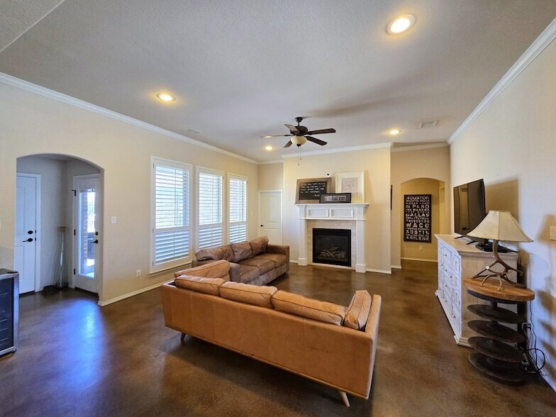 Gorgeous 3-bed, 2-bath home w/an open-concept layout perfect for entertaining! Features include a natural color palette, high ceilings, stained concrete floors, crown molding, wooden shutters, & gas log fireplace. The kitchen boasts granite counters, walk-in pantry, stainless appliances, & high-end gas stove. Sequestered primary suite offers a soaking tub, lg shower, dual vanities, & 2 walk-in closets. New roof, fresh paint, water softener, hot water on demand, 2-car garage, extra side yard, & easy to maintain grounds. Prime location near Loop 250, parks, schools & shopping! For Lease & Sale.