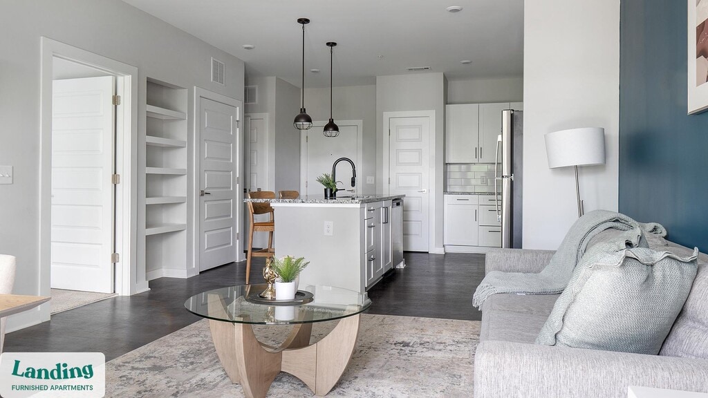 Landing offers flexible lease terms from weeks to months. Please always visit our website or contact us for the latest pricing & availability. Stay longer, save more: 6-Month Minimum base rent: starts at $2320/mo 12-Month Minimum base rent: starts at $1984/mo Landing offers flexible leases across a network of over 35,000 fully-furnished apartments throughout 375+ cities so you can rent on your terms, practically anywhere, and avoid the hassle of paying deposits or application fees. Visit to learn about all the benefits of a Landing membership, see our competitive up-to-date pricing, explore available apartments, take virtual tours, and make reservations online without jumping through traditional rental hoops. Landing's apartments at Series at Riverview Landing are designed for comfortable, easy living, with the ability to stay as long as you like. Experience living with Landing Every apartment is outfitted with all the modern essentials including: custom-designed furnishings, a fully-equipped kitchen with deluxe stainless steel appliances, a gourmet coffee maker, premium linens, Smart TVs, and incredibly fast, reliable internet for working from home. When you live with Landing, you'll enjoy a hassle-free experience with the added benefit of 24/7 access to our dedicated member experience team. Some of the nitty-gritty: a background check and proof of income are required; we're completely smoke-free; bundled utility packages and pricing vary based on length of stay; pet-friendly options available; listed price reflects a 12-month minimum stay.