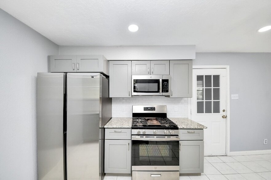 Move-in ready rental! Beautifully updated 3-bedroom, 2-bath home featuring modern upgrades and a spacious, open-concept layout with high ceilings that create a bright and inviting living space.The remodeled kitchen offers contemporary finishes and stainless-steel appliances, perfect for everyday living and entertaining. Patio French doors lead to a private, fenced backyard with a covered patio ideal for relaxing or hosting guests.