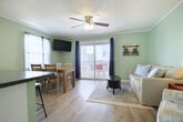 Welcome to the heart of Carolina Beach, where this lakefront apartment offers stunning beach views and a prime location just steps from the sand and surf. Situated on the first floor, the unit features breathtaking lake views from the primary room balcony, allowing you to unwind and enjoy beautiful sunsets. Please note that while the unit is on the ground floor, the building is elevated due to its proximity to the ocean, requiring a flight of stairs for access. There is no elevator, and the property is not wheelchair accessible. This apartment boasts a spacious living room with a pull-out couch and a Roku smart TV for your entertainment. The ample kitchen is equipped with modern appliances, bar seating for three, and a dining table for four. The primary queen bedroom offers a restful night's sleep, while the bunk bed room accommodates additional guests, providing a total sleeping capacity of six. Each unit includes two designated parking spaces. If you're bringing additional vehicles, public parking is available from March 1 to October 31, with rates of $5 per hour or $25 per day. Private parking lots around the boardwalk area typically charge a flat fee ranging from $25 to $60 per day. Golf carts are welcome but count as one of your two parking spaces, and charging golf carts on the property is not permitted. The vibrant atmosphere of downtown Carolina Beach is just a short walk away, with the boardwalk only a quarter mile from the apartment. Enjoy the convenience of nearby attractions such as Fort Fisher Civil War Historic Site and the NC State Aquarium, located six miles to the south. The US North Carolina Battleship, Downtown Wilmington Riverwalk, and exciting nightlife are just 25 minutes away. Amazing restaurants are everywhere, and we're happy to recommend some of our favorites. Smoking is not allowed on the property, and pets are not permitted. Quiet hours are observed from 10:00 PM to 8:00 AM to ensure a peaceful environment for all guests and neighbors. Please be mindful of sand in the unit; an outdoor shower is provided to rinse off excess sand, as clogs can only be cleared by a plumber. Housekeeping services are not provided daily, and guests are encouraged to bring their own beach towels. Walking on the dunes is forbidden, and guests should use the walkway to access the beach. In the event of a storm or hurricane, refunds will only be given if mandatory evacuations are ordered by state or local authorities. [SI]