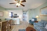 Let the cleansing salt breezes wash over you in this inviting apartment just steps from the beach, offering stunning waterfront views. Enjoy the relaxing sounds of the surf from the master bedroom balcony, where sun and fun await. This apartment features tile and hardwood floors throughout, complemented by cozy throw rugs. The large living room includes a pull-out couch and a Roku smart TV, perfect for movie nights. The well-equipped kitchen with a bar that seats three and a dining table for four makes it ideal for family meals. With one queen bedroom and a bunk bed room, this home comfortably sleeps a total of six guests. Each unit includes two designated parking spaces. If you're bringing additional vehicles, public parking is available with rates of $5 per hour or $25 per day, and private lots typically charge a flat fee ranging from $25 to $60 per day. Golf carts are welcome but count as one of your two parking spaces, and charging golf carts on the property is not permitted. The vibrant Carolina Beach boardwalk is only a quarter-mile away, and the Lake Park is right across the street. Fort Fisher Civil War Historic Site and the NC State Aquarium are six miles to the south. The US North Carolina Battleship, Downtown Wilmington Riverwalk, and exciting nightlife are just 25 minutes away. Amazing restaurants are everywhere, and we're happy to recommend some local favorites. While the unit is located on the ground floor, the building is elevated due to its proximity to the ocean, requiring a flight of stairs for access. There is no elevator, and the property is not wheelchair accessible. Smoking is not allowed, and pets are not permitted. Quiet hours are observed from 10:00 PM to 8:00 AM to ensure a peaceful environment for all guests and neighbors. Please avoid showering off excess sand in the shower or bath to prevent clogs.