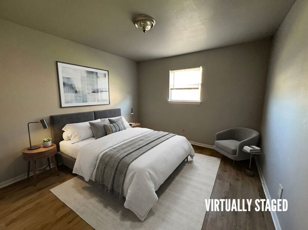 View 360 Virtual Tour: 2 bed 1 bath apartment with a modern design style. Features wood plank flooring, no carpet, and black appliances. Cats are allowed, and HUD / Section 8 is accepted. Come by our office to see this property today. Disclaimer: The furnishings or enhancements shown are AI-generated and intended for inspiration only. They may not reflect the actual scale, condition, or current features of the property.